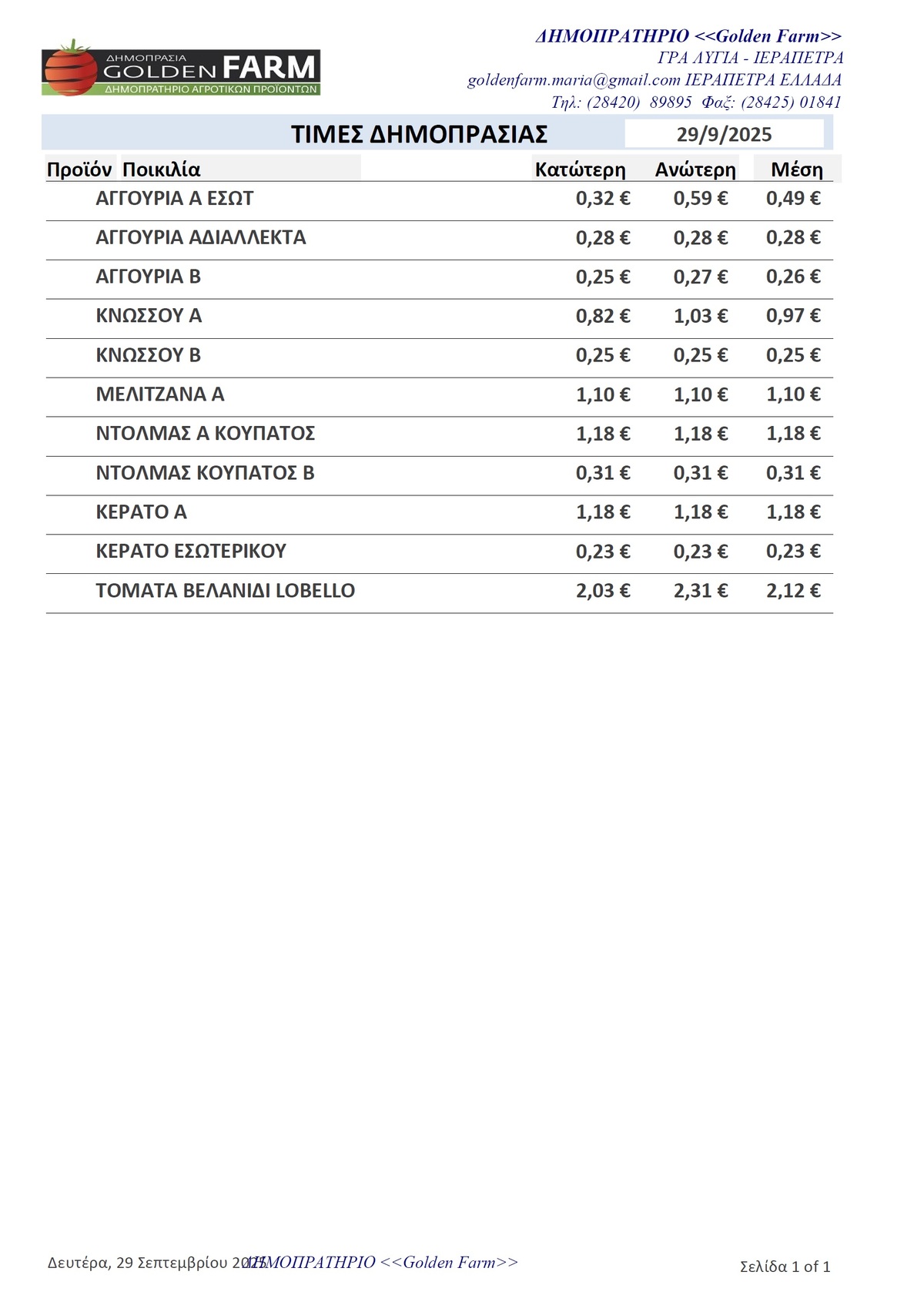 GOLDEN FARM |Τιμές Αγροτικών Προϊόντων 29.09.2025 ΤΙΜΕΣ 2:57 μ.μ. - Δευτέρα, 29 Σεπτεμβρίου 2025 02:09 μ.μ. - Δευ, 29/57/2025 ΙΕΡΑΠΕΤΡΑ, ΤΙΜΕΣ ΑΓΡΟΤΙΚΩΝ ΠΡΟΙΟΝΤΩΝ , ΚΗΠΕΥΤΙΚΑ , GOLDEN FARM Δείτε τις σημερινές τιμές του δημοπρατηρίου