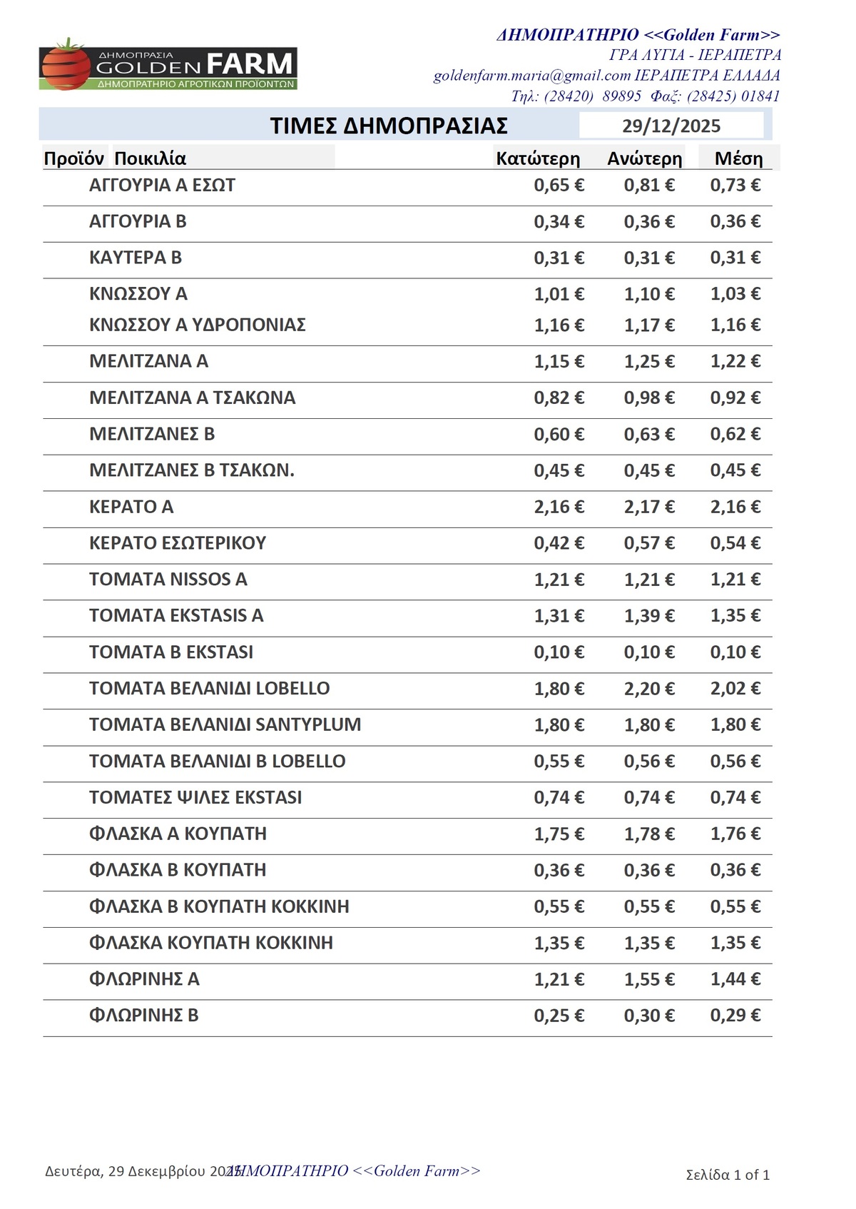 GOLDEN FARM |Τιμές Αγροτικών Προϊόντων 29.12.2025 ΤΙΜΕΣ 5:51 μ.μ. - Δευτέρα 29 Δεκεμβρίου 2025 05:12 μ.μ. - Δευ, 29/51/2025 ΙΕΡΑΠΕΤΡΑ, ΤΙΜΕΣ ΑΓΡΟΤΙΚΩΝ ΠΡΟΙΟΝΤΩΝ , ΔΗΜΟΠΡΑΤΗΡΙΟ, ΚΗΠΕΥΤΙΚΑ , GOLDEN FARM Δείτε τις σημερινές τιμές του δημοπρατηρίου
