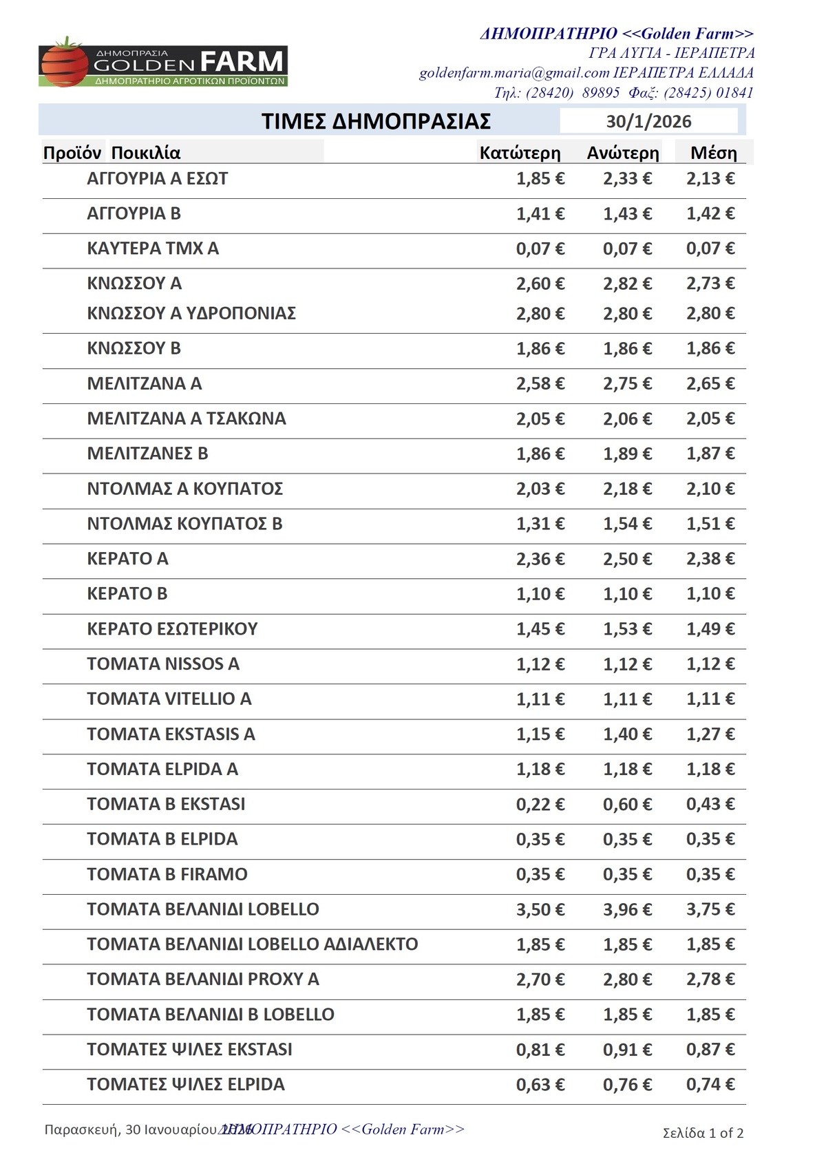 GOLDEN FARM |Τιμές Αγροτικών Προϊόντων 30.01.2026 ΤΙΜΕΣ 2:29 μ.μ. - Παρασκευή 30 Ιανουαρίου 2026 02:01 μ.μ. - Παρ, 30/29/2026 ΙΕΡΑΠΕΤΡΑ, ΤΙΜΕΣ ΑΓΡΟΤΙΚΩΝ ΠΡΟΙΟΝΤΩΝ , ΔΗΜΟΠΡΑΤΗΡΙΟ, ΚΗΠΕΥΤΙΚΑ , GOLDEN FARM Δείτε τις σημερινές τιμές του δημοπρατηρίου