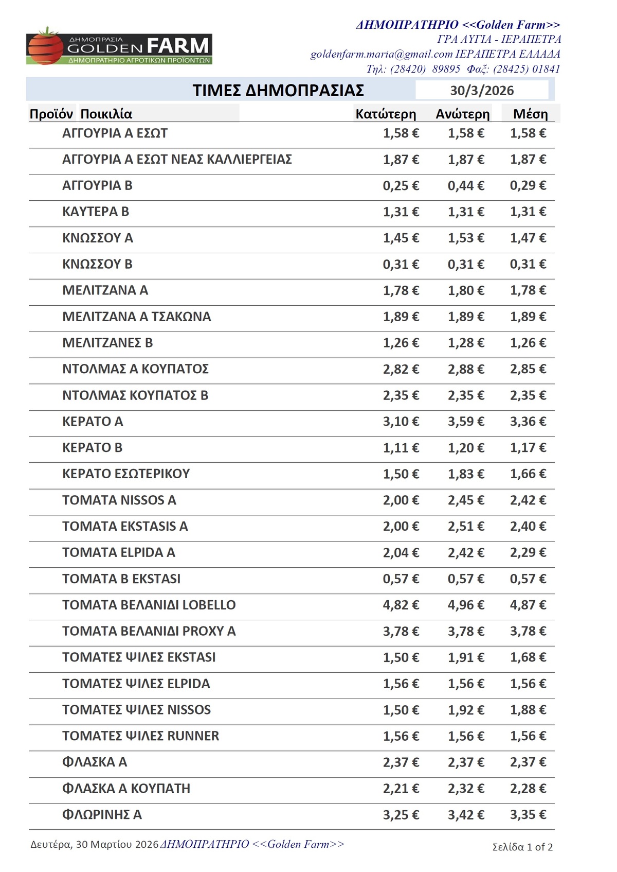 GOLDEN FARM |Τιμές Αγροτικών Προϊόντων 30.03.2026 ΤΙΜΕΣ 3:44 μ.μ. - Δευτέρα 30 Μαρτίου 2026 03:03 μ.μ. - Δευ, 30/44/2026 ΙΕΡΑΠΕΤΡΑ, ΤΙΜΕΣ ΑΓΡΟΤΙΚΩΝ ΠΡΟΙΟΝΤΩΝ , ΔΗΜΟΠΡΑΤΗΡΙΟ, ΚΗΠΕΥΤΙΚΑ , GOLDEN FARM Δείτε τις σημερινές τιμές του δημοπρατηρίου
