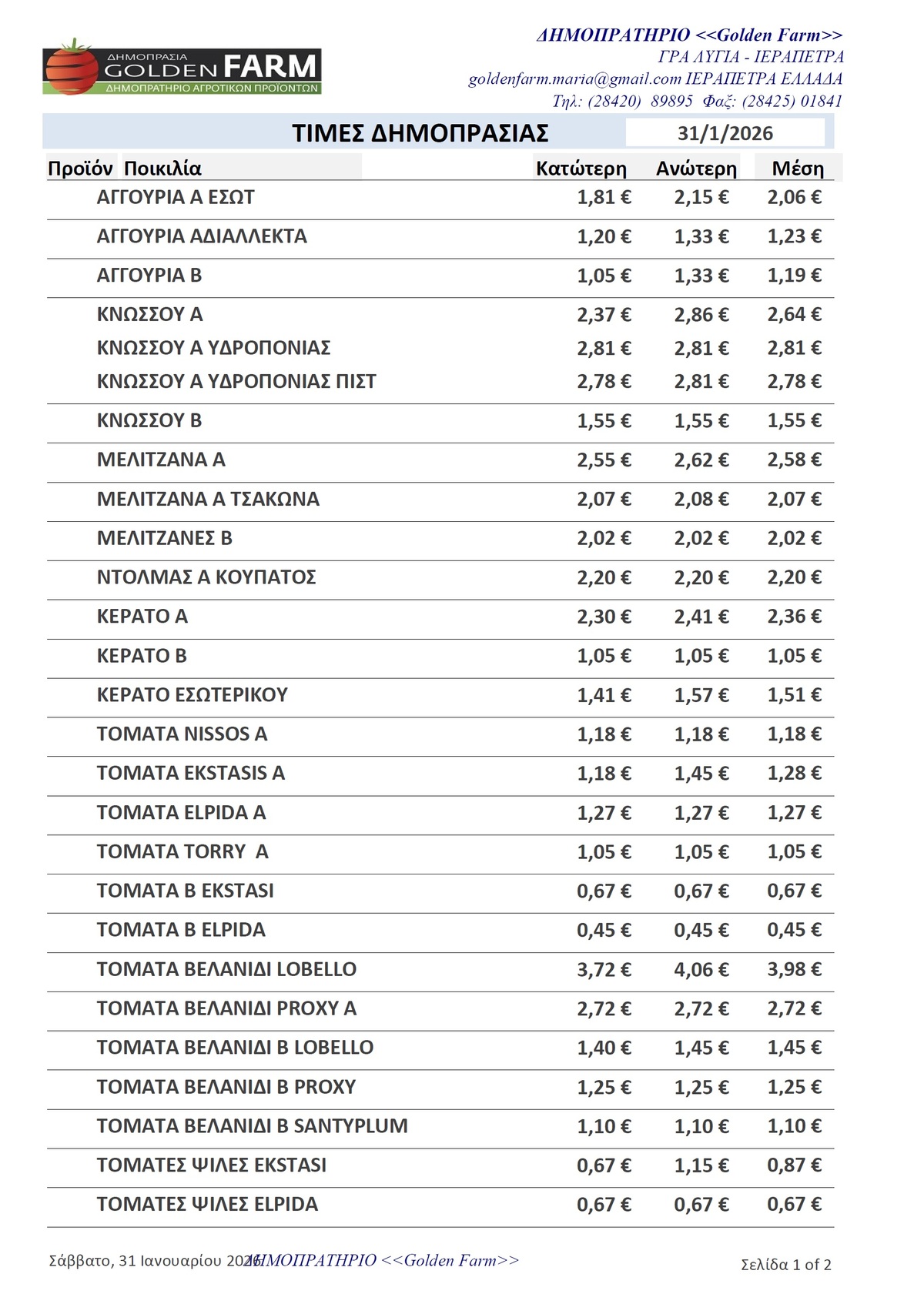 ΤΙΜΕΣ 03:00 μ.μ. - 28/01/2026 GOLDEN FARM |Τιμές Αγροτικών Προϊόντων 28.01.2026 ΙΕΡΑΠΕΤΡΑ, ΤΙΜΕΣ ΑΓΡΟΤΙΚΩΝ ΠΡΟΙΟΝΤΩΝ , ΔΗΜΟΠΡΑΤΗΡΙΟ, ΚΗΠΕΥΤΙΚΑ , GOLDEN FARM Δείτε τις σημερινές τιμές του δημοπρατηρίου