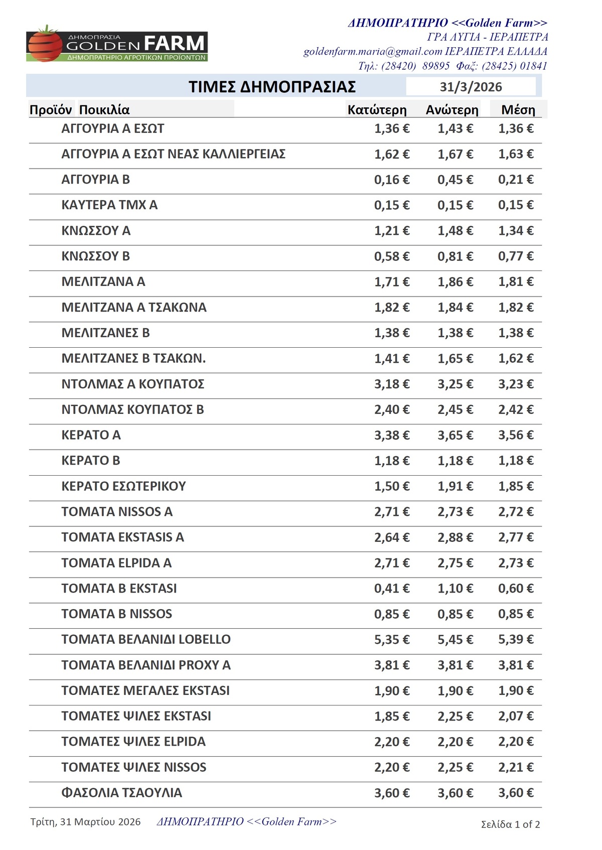 GOLDEN FARM |Τιμές Αγροτικών Προϊόντων 31.03.2026 ΤΙΜΕΣ 3:43 μ.μ. - Τρίτη 31 Μαρτίου 2026 03:03 μ.μ. - Τρί, 31/43/2026 ΙΕΡΑΠΕΤΡΑ, ΤΙΜΕΣ ΑΓΡΟΤΙΚΩΝ ΠΡΟΙΟΝΤΩΝ , ΔΗΜΟΠΡΑΤΗΡΙΟ, ΚΗΠΕΥΤΙΚΑ , GOLDEN FARM Δείτε τις σημερινές τιμές του δημοπρατηρίου