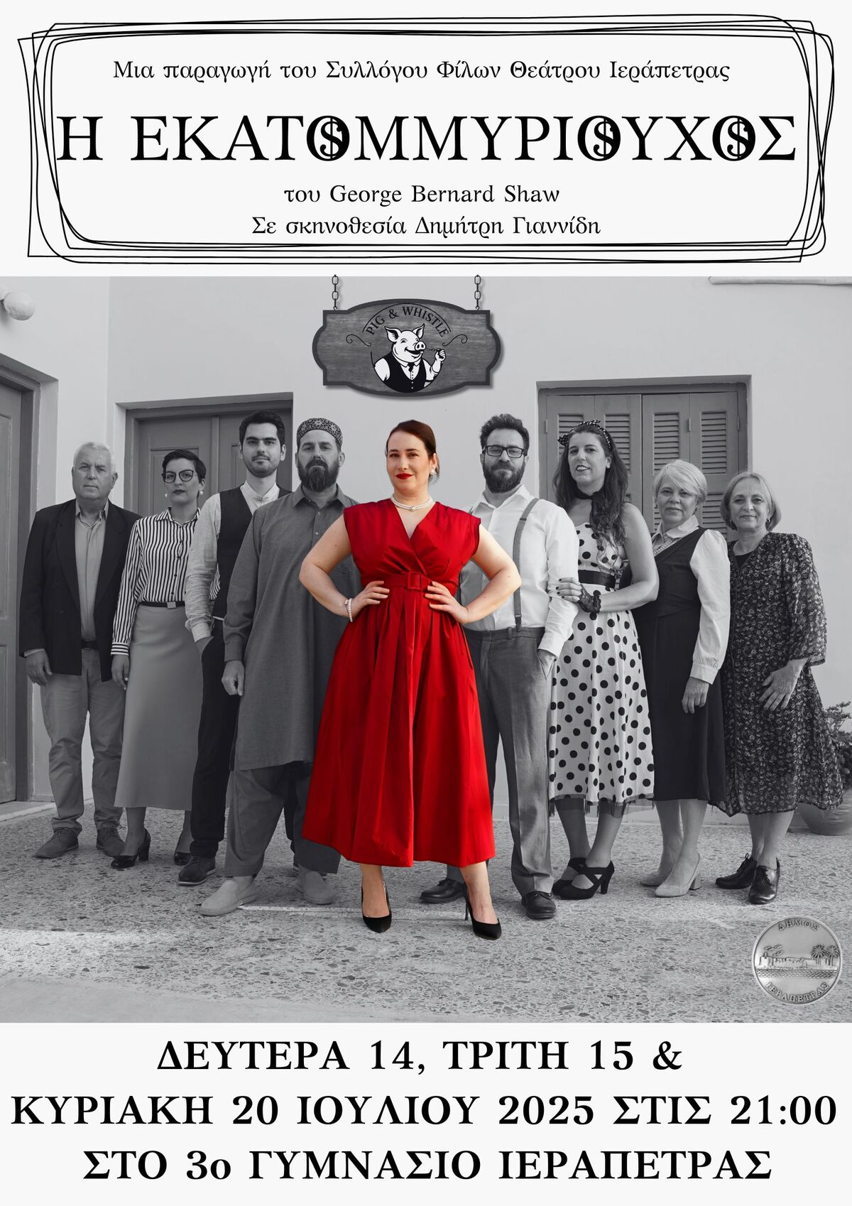 Με ιδιαίτερη χαρά και υπερηφάνεια παρουσιάζουμε στο θεατρόφιλο κοινό της Ιεράπετρας το ευφυές, διαχρονικό και κοινωνικά καυστικό έργο του Τζορτζ Μπέρναρντ Σω, "Η Εκατομμυριούχος".