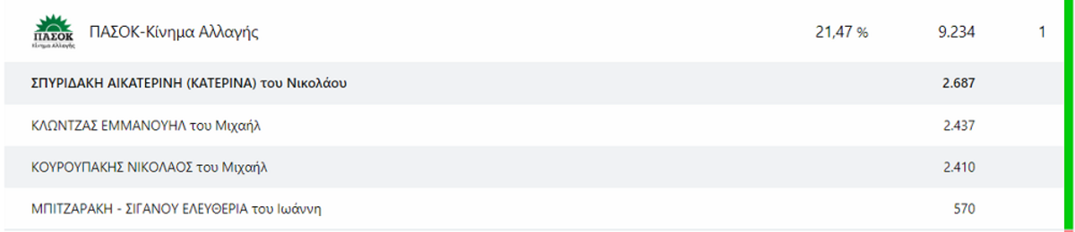 Η Κατερίνα Σπυριδάκη, ένας νέος άνθρωπος από την Ιεράπετρα, φαίνεται πως εκλέγεται ως Βουλευτής στον νομό Λασιθίου με το ΠΑΣΟΚ ΚΙΝΑΛ που (μετά τη Ν.Δ. και τον Γιάννη Πλακιωτάκη) καταλαμβάνει την δεύτερη έδρα στον νομό.