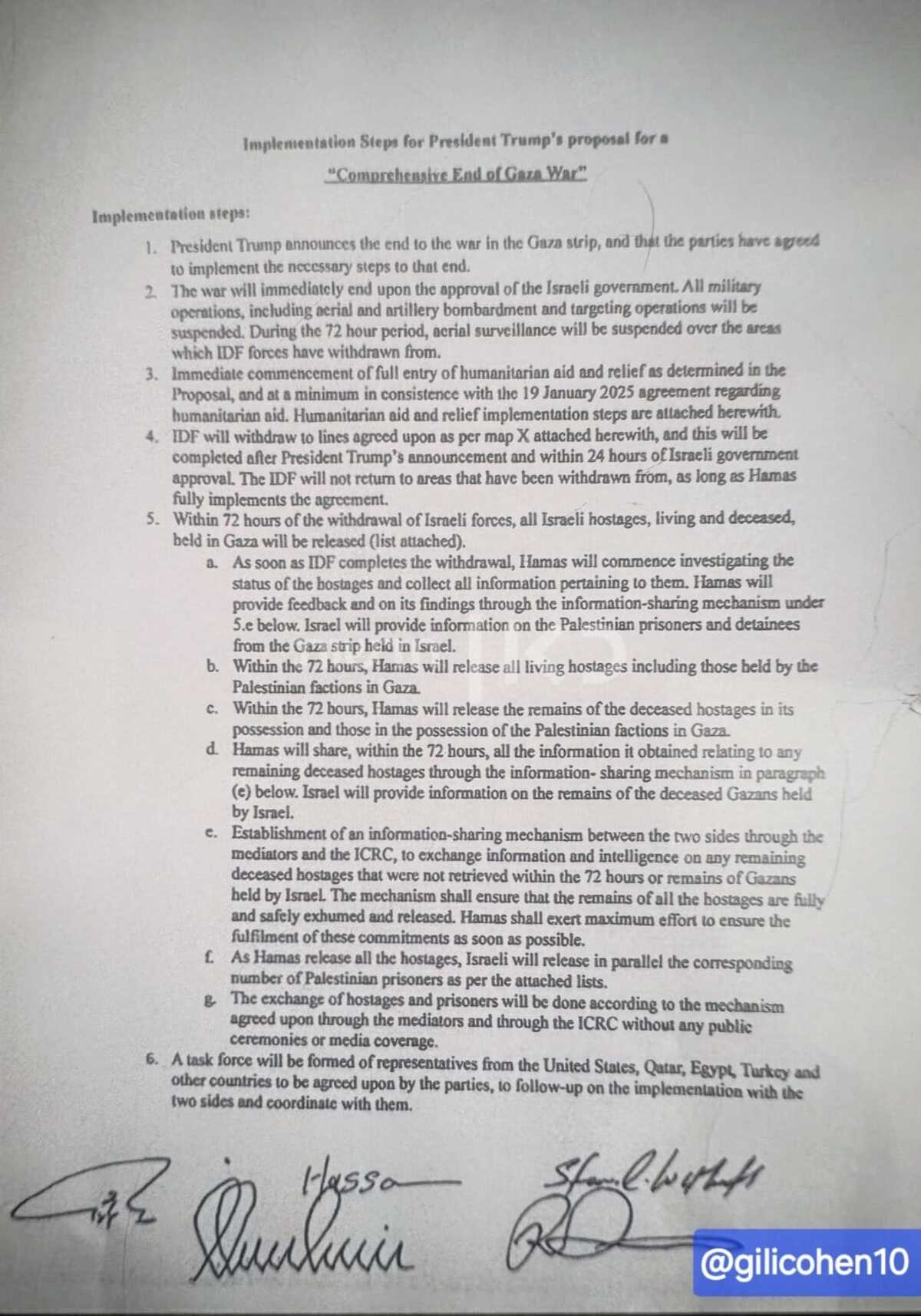 Το έγγραφο που περιγράφει λεπτομερώς την εφαρμογή της πρότασης του Τραμπ για «ολοκληρωτικό τέλος του πολέμου στη Γάζα», όπως συμφωνήθηκε από το Ισραήλ και τη Χαμάς, αποκαλύφθηκε την Πέμπτη το βράδυ, λίγο πριν η κυβέρνηση του Ισραήλ εγκρίνει τη συμφωνία.