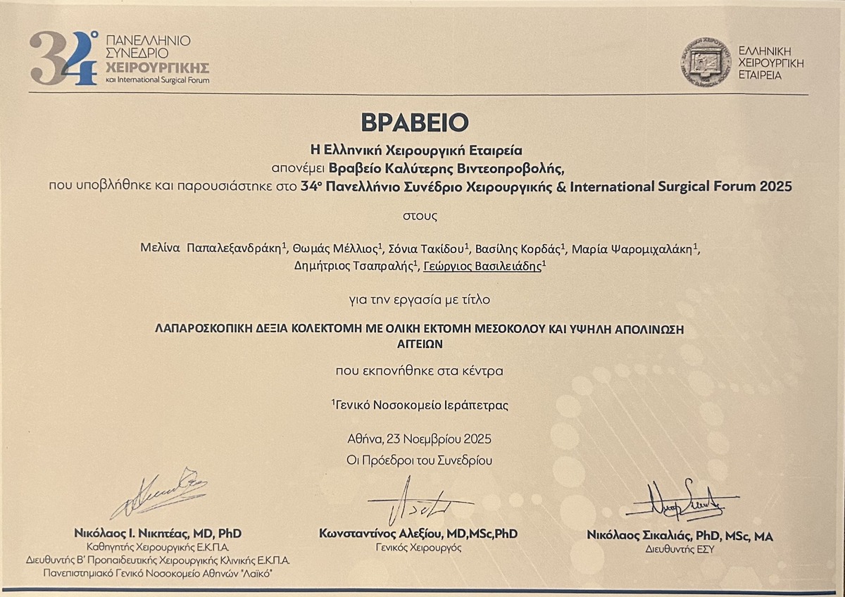 Λαμπρή διάκριση για τον Γ. Βασιλειάδης και τη Χειρουργική Κλινική Ιεράπετρας στο 34ο Πανελλήνιο Συνέδριο Χειρουργικής