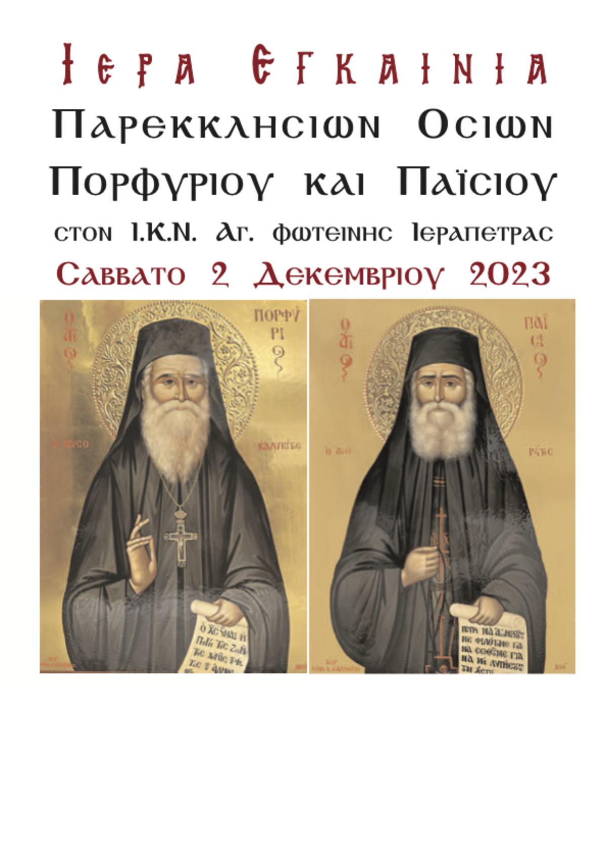 Το Σάββατο 2 Δεκεμβρίου 2023, εορτή του Οσίου και Θεοφόρου Πατρός ημών Πορφυρίου του Καυσοκαλυβίτου, ο Σεβ. Μητροπολίτης Ιεραπύτνης και Σητείας κ. ΚΥΡΙΛΛΟΣ θα τελέσει τα Ιερά Εγκαίνια των Παρεκκλησίων επ᾽ ονόματι των Οσίων Πορφυρίου του Καυσοκαλυβίτου και Παϊσίου του Αγιορείτου, του Ιερού Ναού Οσίου Νίκωνος (ισόγειο Ιερού Καθεδρικού Ναού Αγίας Φωτεινής Ιεράπετρας).