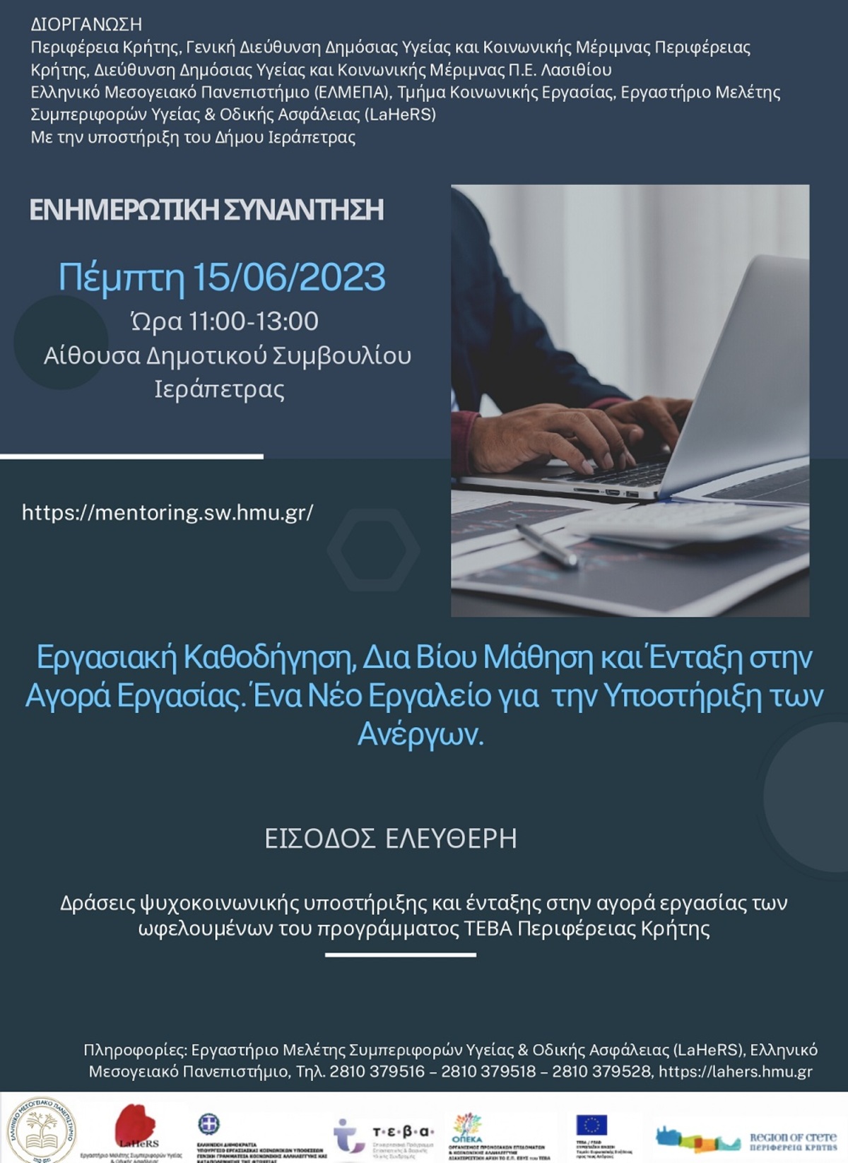 Την Πέμπτη, 15 Ιουνίου 2023 και ώρα 11:00π.μ.-1:00μ.μ, στην αίθουσα του Δημοτικού Συμβουλίου Ιεράπετρας, σε συνεργασία με τη Διεύθυνση Δημόσιας Υγείας και Κοινωνικής Μέριμνας της Π.Ε. Λασιθίου και με την υποστήριξη του Δήμου Ιεράπετρας, πρόκειται να πραγματοποιηθεί δια ζώσης η επόμενη ενημερωτική συνάντηση στην οποία καλούνται εργοδότες, άνεργοι, επιχειρηματίες, ωφελούμενοι του ΤΕΒΑ, αλλά και ιδιώτες, για να ενημερωθούν για τις ωφέλειες που μπορούν να λάβουν από την πλατφόρμα Mentoring.