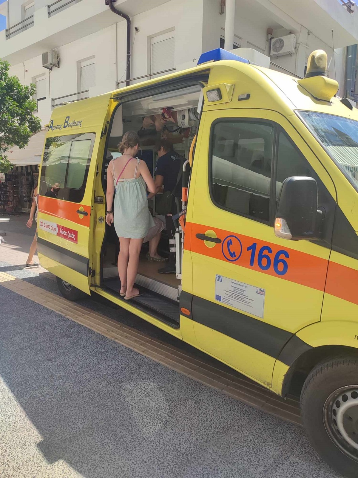 Στο τέλος κλήθηκε το ΕΚΑΒ όπου και παρέλαβε την τουρίστρια για τις πρώτες βοήθειες .