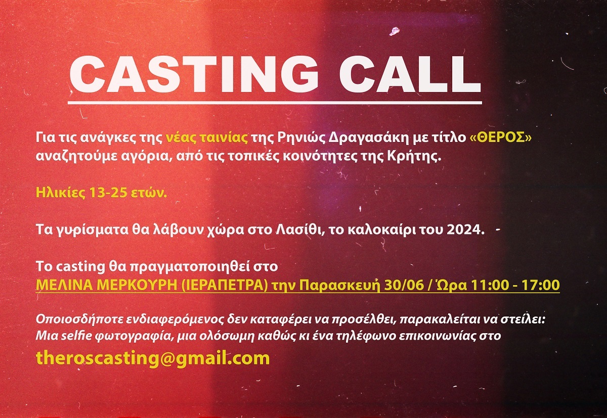 Ιεράπετρα:Casting Call για τη νέα ταινία της Ρηνιώς Δραγασάκη ΙΕΡΑΠΕΤΡΑ 2:33 μ.μ. - Δευτέρα 26 Ιουνίου 2023 02:06 μ.μ. - Δευ, 26/33/2023 ΠΟΛΙΤΙΣΜΟΣ , ΡΗΝΙΩ ΔΡΑΓΑΣΑΚΗ, ΝΕΑ ΤΑΙΝΙΑ, CASTING Τα γυρίσματα θα λάβουν χώρα στο Λασίθι, το καλοκαίρι του 2024.