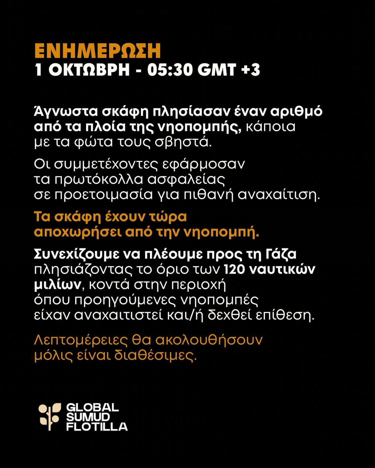 Νωρίτερα, ο στολίσκος Global Sumud Flotilla είχε καταγγείλει πως άγνωστα σκάφη με σβηστά τα φώτα ναυσιπλοΐας πλησίασαν τα πλοιάρια με την ανθρωπιστική βοήθεια. Όπως ανέφερε, τα άγνωστα αυτά σκάφη απομακρύνθηκαν και τα πληρώματα του διεθνή στολίσκου εφάρμοσαν πρωτόκολλα ασφάλειας, αναμένοντας πιθανή παρεμπόδιση της πορείας τους.
