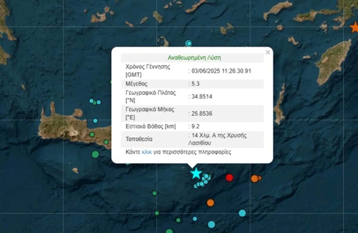 Σύμφωνα με το Γεωδυναμικό Ινστιτούτο ήταν μεγέθους 5,3 Ρίχτερ και το επίκεντρο του 14 χλμ Aνατολικά της Xρυσής, στη θαλάσσια περιοχή νότια του Λασιθίου. Το εστιακό βάθος του σεισμού βρισκόταν στα 9,2 χλμ.
