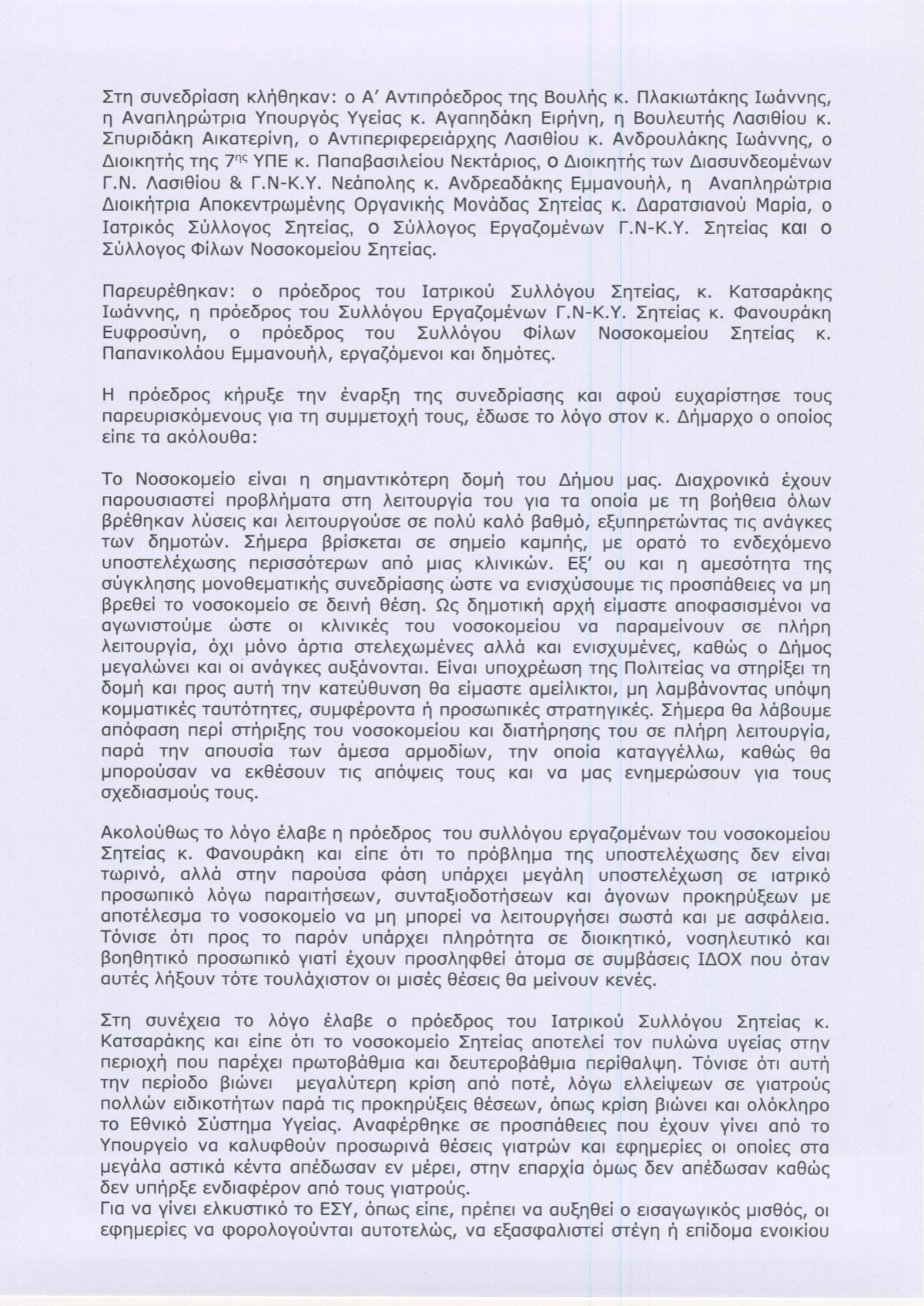Γνωρίζετε ίσως τη μεγάλη σημασία και τους αγώνες του λαού της Νοτιοανατολικής Κρήτης για ένα αυτόνομο και καλά στελεχωμένο Νοσοκομείο στην πόλη της Ιεράπετρας. Ένα Νοσοκομείο που για διάφορους λόγους και είμαστε στη διάθεση σας να σας αναλύσουμε, είναι συνυφασμένο με την επιβίωση της ευρύτερης περιοχής μας.