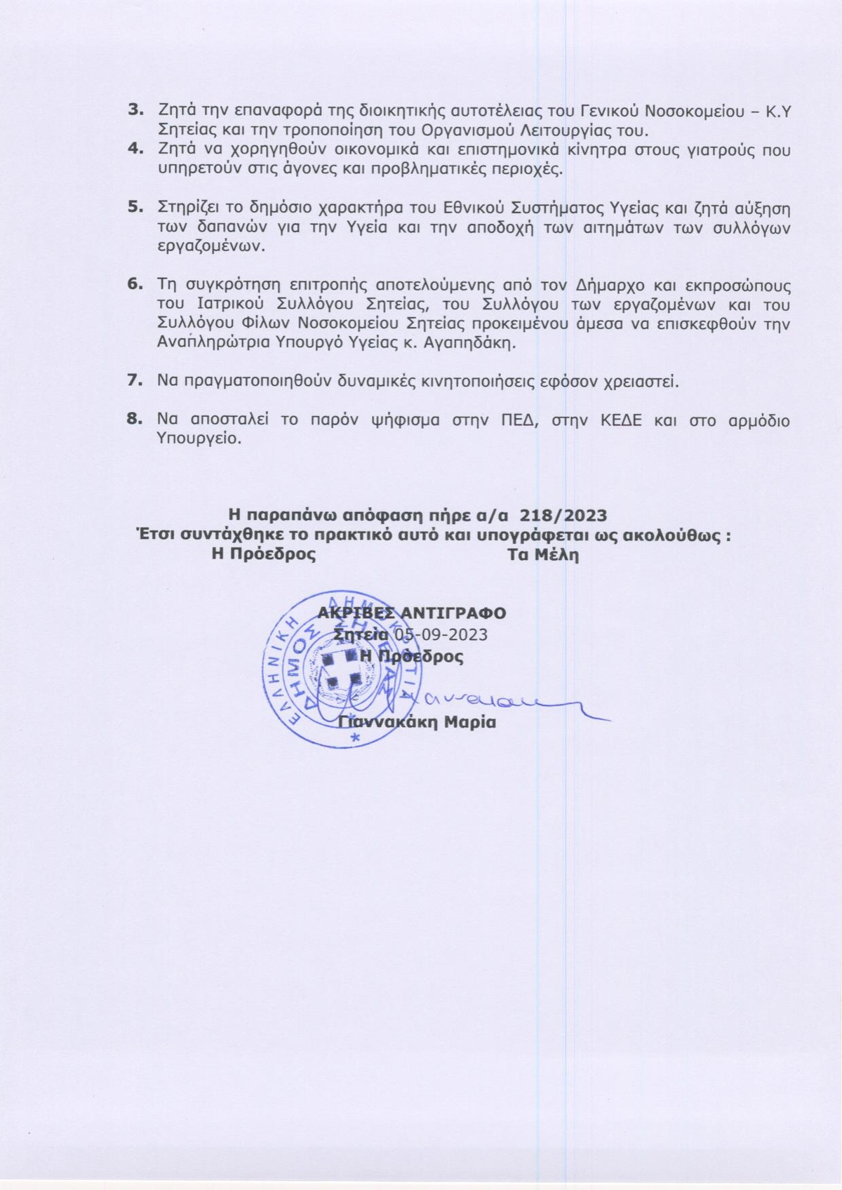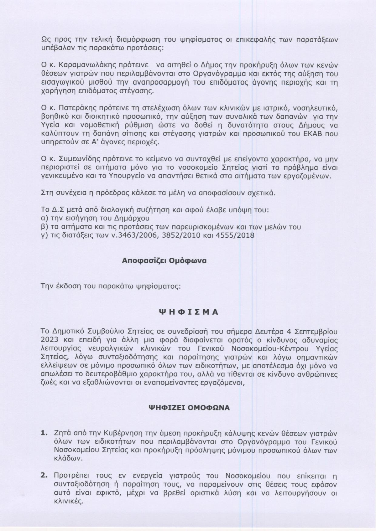 Ζητά την λήψη μέτρων για την εύρυθμη λειτουργία του Νοσοκομείου Σητείας, σύμφωνα με το Ψήφισμα του Δημοτικού Συμβουλίου, απευθυνόμενοι στους Υπουργούς Υγείας κ. Χρυσοχοΐδη και κα. Αγαπηδάκη, συγκεκριμένα επισημαίνεται ο κίνδυνος αδυναμίας λειτουργίας νευραλγικών κλινικών του Νοσοκομείου, λόγω συνταξιοδότησης και παραιτήσεων γιατρών και λόγω ελλείψεων σε μόνιμο προσωπικό όλων των ειδικοτήτων και ζητείται από την Κυβέρνηση να προκηρύξει άμεσα την πλήρωση των κενών θέσεων ιατρικού προσωπικού όλων των ειδικοτήτων, καθώς και λοιπού προσωπικού. Επίσης ζητείται η επαναφορά της διοικητικής αυτοτέλειας του Νοσοκομείου Σητείας, καθώς και η παροχή οικονομικών και επαγγελματικών κίνητρων στους γιατρούς ,που υπηρετούν σε άγονες και προβληματικές περιοχές.