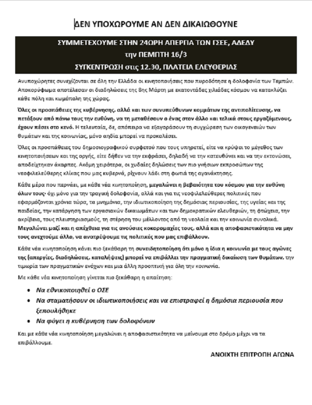 Τώρα είναι η ώρα να μετατρέψουμε το θυμό και την αγανάκτησή μας σε οργανωμένη δύναμη για να ξεμπροστιάσουμε τους επιχειρηματικούς ομίλους, το κράτος τους και όλες τις κυβερνήσεις που στηρίζουν την πολιτική που λογαριάζει ως κόστος την ασφάλεια και την προστασία της ζωής μας. Με το συλλογικό αγώνα μας απαιτούμε να πληρώσουν και να τιμωρηθούν όλοι οι «μηχανοδηγοί» του τρένου της στρατηγικής της Ευρωπαϊκής Ένωσης που υπηρέτησαν πιστά την “απελευθέρωση” των μεταφορών. Αυτοί προχώρησαν στην κατάτμηση του ΟΣΕ, χαρίζοντας στους ομίλους εκατομμύρια κάθε χρόνο μέχρι σήμερα. Αυτοί ευθύνονται για την τραγική υποχρηματοδότηση στις υποδομές, την απουσία ηλεκτρονικών συστημάτων ασφαλείας, τη θεσμοθέτηση της 9ημερης συνεχόμενης δουλειάς για τους σιδηροδρομικούς, τις χιλιάδες κενές θέσεις εργασίας στα τρένα, μέχρι και την κάλυψη θέσεων σταθμαρχών με μπλοκάκι.