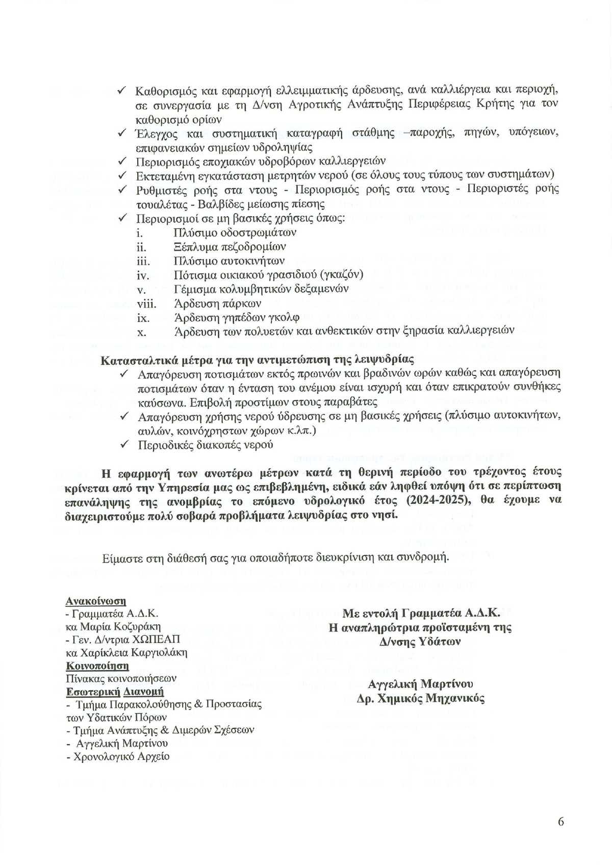 Η εφαρμογή των ανωτέρω μέτρων κατά τη θερινή περίοδο του τρέχοντος έτους κρίνεται από την Υπηρεσία μας ως επιβεβλημένη, ειδικά εάν ληφθεί υπόψη ότι σε περίπτωση επανάληψης της ανομβρίας το επόμενο υδρολογικό έτος ( 2024-2025), θα έχουμε να διαχειριστούμε πολύ σοβαρά προβλήματα λειψυδρίας στο νησί.