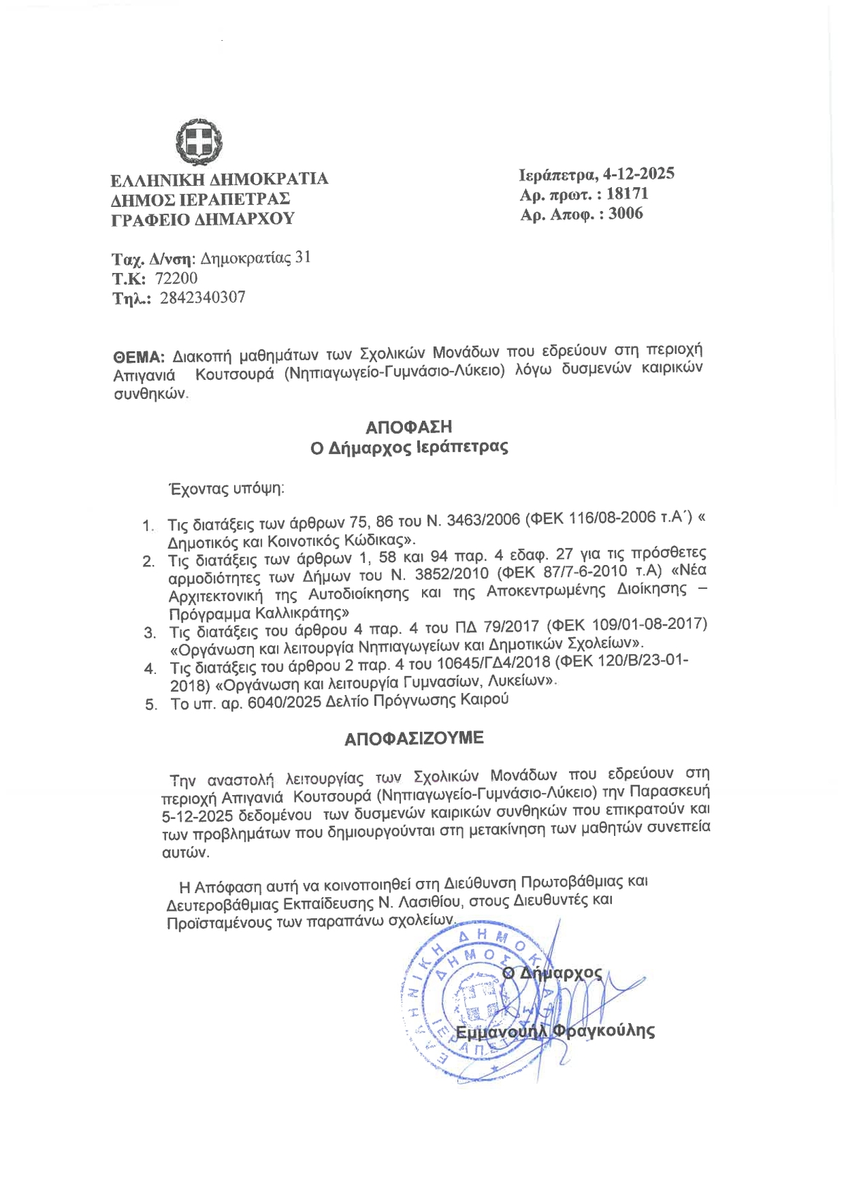 Ο Δήμος Ιεράπετρας ενημερώνει ότι, με απόφαση του Δημάρχου Εμμανουήλ Φραγκούλη, την Παρασκευή 5 Δεκεμβρίου 2025 θα παραμείνουν κλειστές όλες οι σχολικές μονάδες που εδρεύουν στην περιοχή Απηγανιά Κουτσουρά (Νηπιαγωγείο – Γυμνάσιο – Λύκειο).