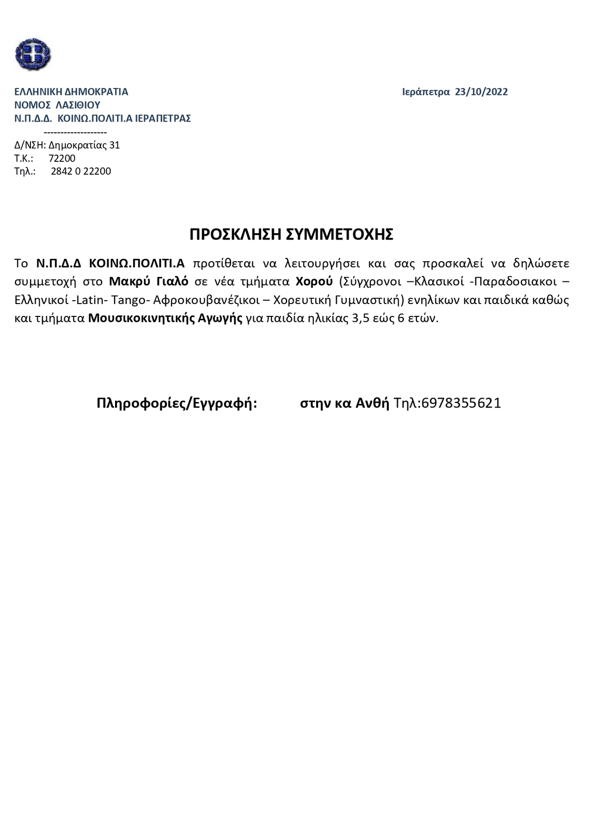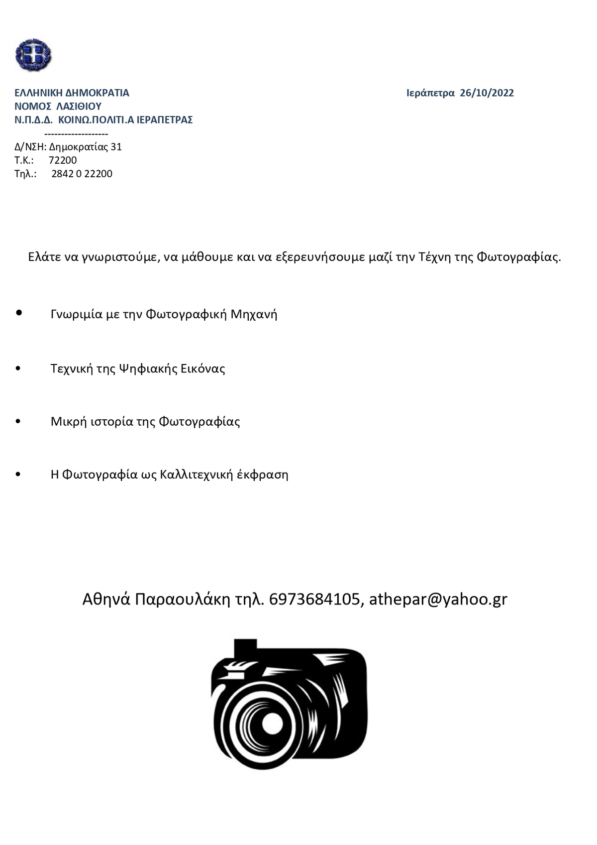 ΚΟΙΝΩ.ΠΟΛΙΤΙ.Α: Λειτουργία τμημάτων φωτογραφίας στην Ιεράπετρα και χορού στο Μακρύ Γιαλό ΙΕΡΑΠΕΤΡΑ 1:37 μ.μ. - Πέμπτη 26 Οκτωβρίου 2023 01:10 μ.μ. - Πέμ, 26/37/2023 ΚΟΙΝΩ.ΠΟΛΙΤΙ.Α., ΧΟΡΟΣ, ΦΩΤΟΓΡΑΦΙΑΣ, ΜΑΘΗΜΑΤΑ Δείτε αναλυτικά :