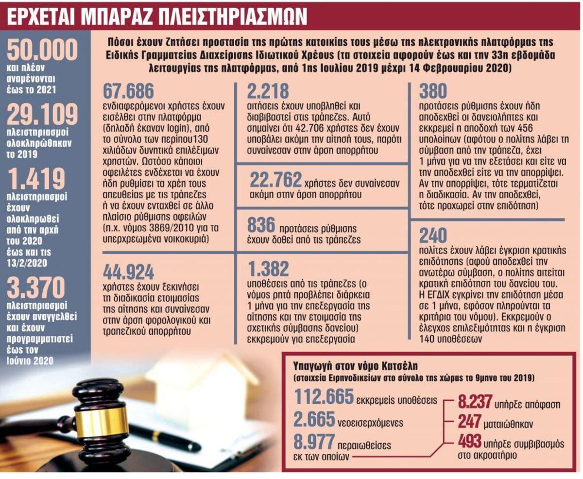 Ενδεικτικό είναι ότι στις διαπραγματεύσεις με τους θεσμούς, σύμφωνα με πληροφορίες, τέθηκε ως στόχος να διενεργηθούν περί τους 50.000 πλειστηριασμούς έως το 2021, αριθμός ιδιαίτερα υψηλός εάν σκεφτεί κανείς ότι το 2019 ο αριθμός των πλειστηριασμών που έγιναν έφτασε τους 29.109. Από την αρχή του 2020 έως και την περασμένη Πέμπτη (13/2/2020) ολοκληρωθήκαν συνολικά 1.419 πλειστηριασμοί, ενώ έχουν πάρει ημερομηνία διεξαγωγής έως και τον ερχόμενο Ιούνιο 3.370, με τον αριθμό να αυξάνεται καθημερινά.