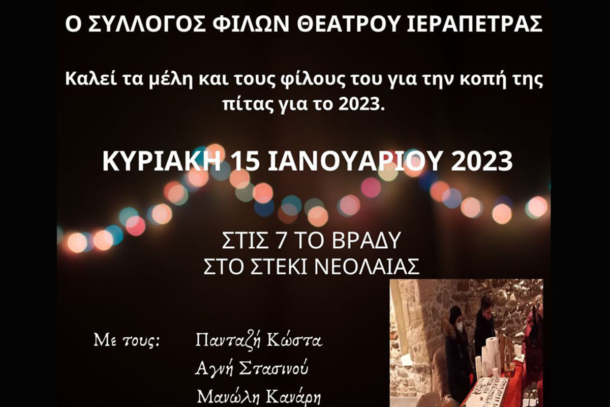 Κοπή πίτας του Συλλόγου Φίλων Θεάτρου Ιεράπετρας ΛΑΣΙΘΙ ΙΕΡΑΠΕΤΡΑ 10:36 π.μ. - Δευτέρα 9 Ιανουαρίου 2023 10:01 π.μ. - Δευ, 09/36/2023 ΙΕΡΑΠΕΤΡΑ, ΚΟΠΗ ΠΙΤΑΣ, ΣΥΛΛΟΓΟΣ ΦΙΛΩΝ ΘΕΑΤΡΟΥ, ΣΤΕΚΙ ΝΕΟΛΑΙΑΣ Την Κυριακή 15 Ιανουαρίου στο Στέκι Νεολαίας