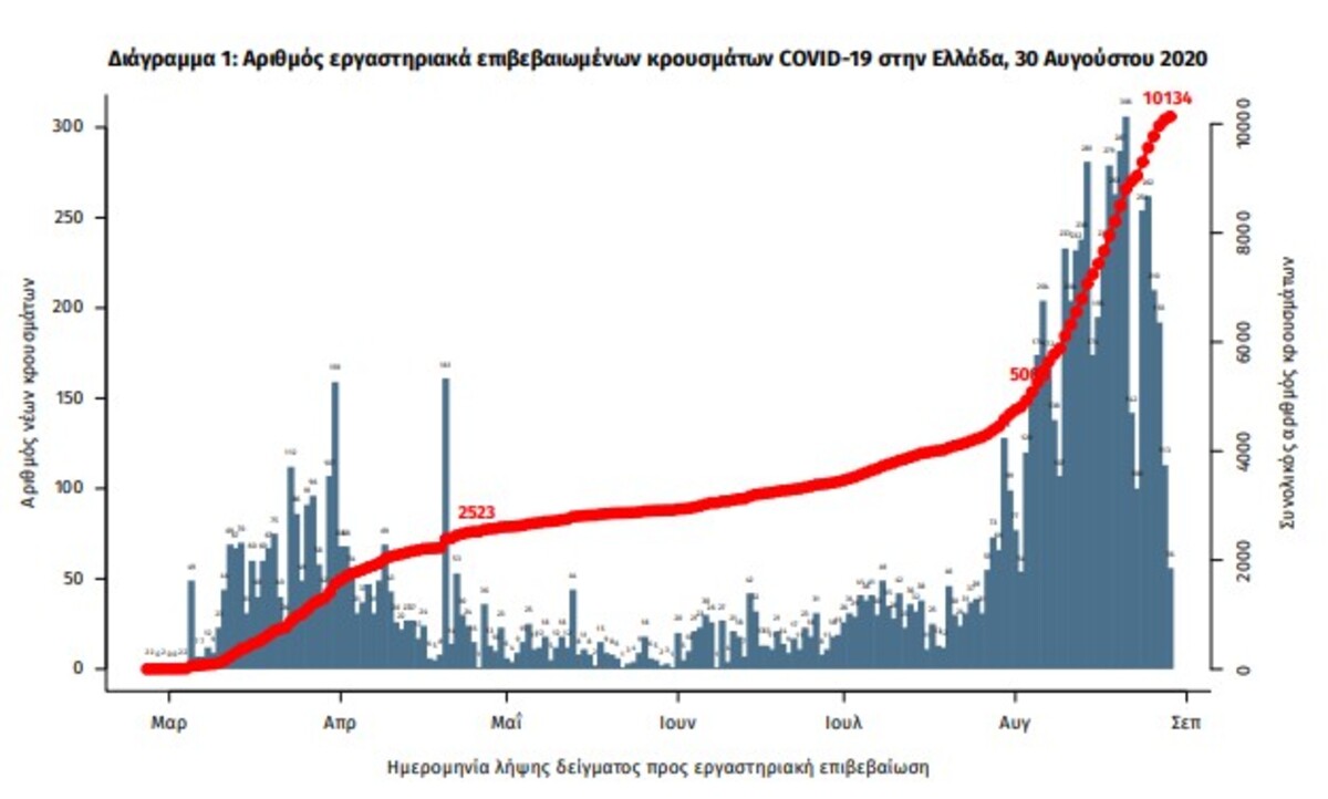 Συγκεκριμένα, από την 1η Αυγούστου, έως τις 30 έχουν ανακοινωθεί 5.791 νέα κρούσματα, ενώ από τα τέλη Φεβρουαρίου, όταν και καταγράφηκε το πρώτο κρούσμα στην Ελλάδα, έως και τις 31 Ιουλίου είχαν καταγραφεί 4.343. Αυτός είναι -μεταξύ άλλων- και ο λόγος που παρά τη μείωση κρουσμάτων και σήμερα, οι επιστήμονες δεν προτρέχουν να μιλήσουν για υποχώρηση του ιού στη χώρα μας.