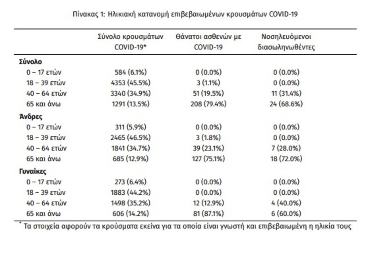 Η μέση ηλικία των κρουσμάτων είναι 39 έτη (εύρος 0 έως 102 ετών), ενώ η μέση ηλικία των θανάτων είναι 77 έτη (εύρος 35 έως 102 ετών). Η ηλικιακή κατανομή των (α) συνολικών κρουσμάτων, (β) των περιστατικών που κατέληξαν σε θάνατο και (γ) των ασθενών που νοσηλεύονται διασωληνωμένοι, είναι η ακόλουθη: