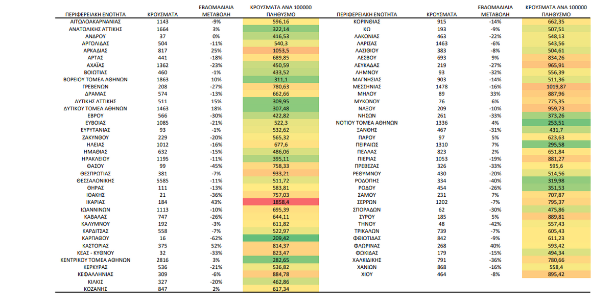 Στον πίνακα που ακολουθεί δείτε πως διαμορφώθηκε η γεωγραφική κατανομή των νέων μολύνσεων την εβδομάδα αναφοράς: