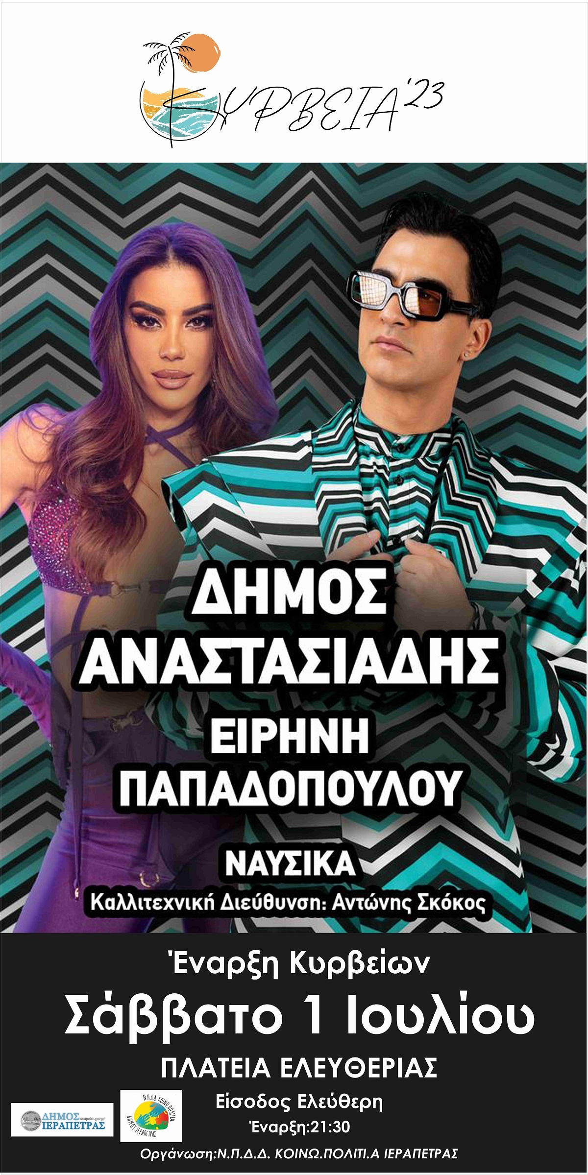 ΚΥΡΒΕΙΑ 2023 –Ιεράπετρα: Έναρξη με μια εκπληκτική συναυλία με Δήμο Αναστασιάδη ΛΑΣΙΘΙ ΙΕΡΑΠΕΤΡΑ 1:01 μ.μ. - Τρίτη 27 Ιουνίου 2023 01:06 μ.μ. - Τρί, 27/01/2023 ΔΗΜΟΣ ΙΕΡΑΠΕΤΡΑΣ, ΠΡΟΓΡΑΜΜΑ, ΚΥΡΒΕΙΑ 2023 Το Σάββατο 1η Ιουλίου στην πλατεία Ιεράπετρας – Αναλυτικά το πρόγραμμα των εκδηλώσεων
