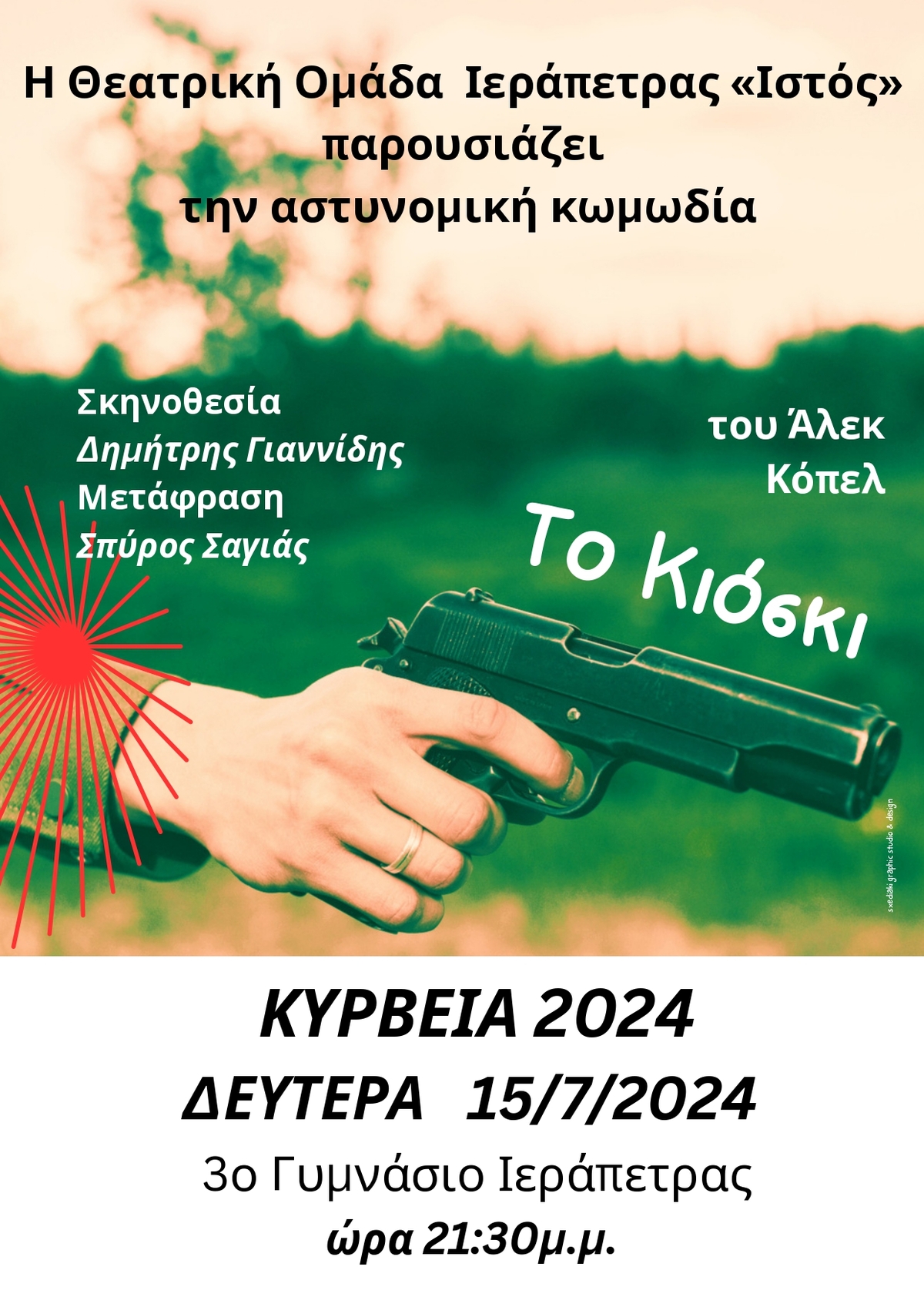 Η αστυνομική κωμωδία «ΤΟ ΚΙΟΣΚΙ» του Άλεκ Κόπελ, σε μετάφραση Σπύρου Σαγιά και σκηνοθεσία Δημήτρη Γιαννίδη, που παρουσιάζει η Θεατρική Ομάδα Ιεράπετρας «Ιστός» - Θέατρο Αλληλεγγύης, ανεβαίνει ξανά στην σκηνή στα πλαίσια των καλοκαιρινών εκδηλώσεων Κύρβεια 2024 την Δευτέρα 15/7/2024 και ώρα 21.30 στο 3ο Γυμνάσιο Ιεράπετρας.