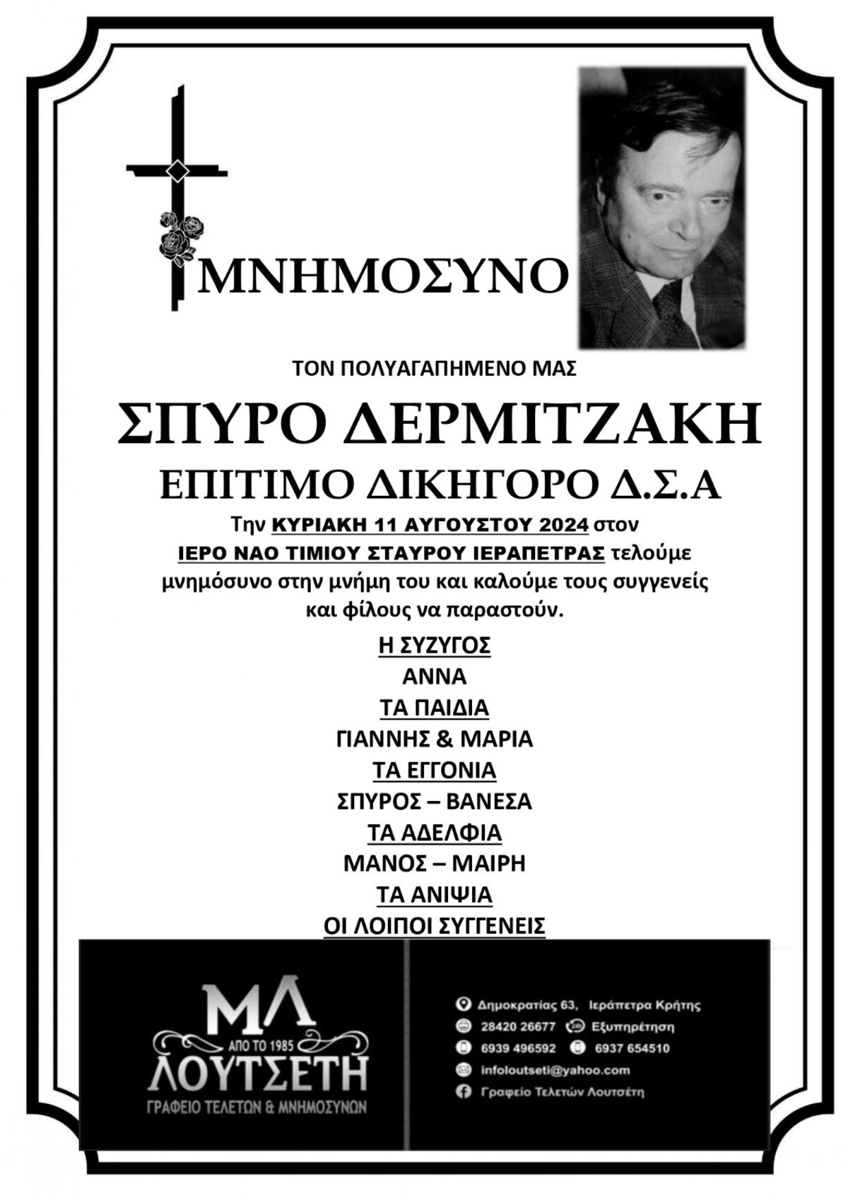 Μνημόσυνο στην μνήμη του Σπύρου Δερμιτζάκη ΛΑΣΙΘΙ ΙΕΡΑΠΕΤΡΑ 10:01 π.μ. - Δευτέρα 5 Αυγούστου 2024 10:08 π.μ. - Δευ, 05/01/2024 ΙΕΡΑΠΕΤΡΑ, ΜΝΗΜΟΣΥΝΟ, ΣΠΥΡΟΣ ΔΕΡΜΙΤΖΑΚΗΣ Την Κυριακή 11 Αυγούστου στον Ι.Ν. Τίμιου Σταυρού Ιεράπετρας