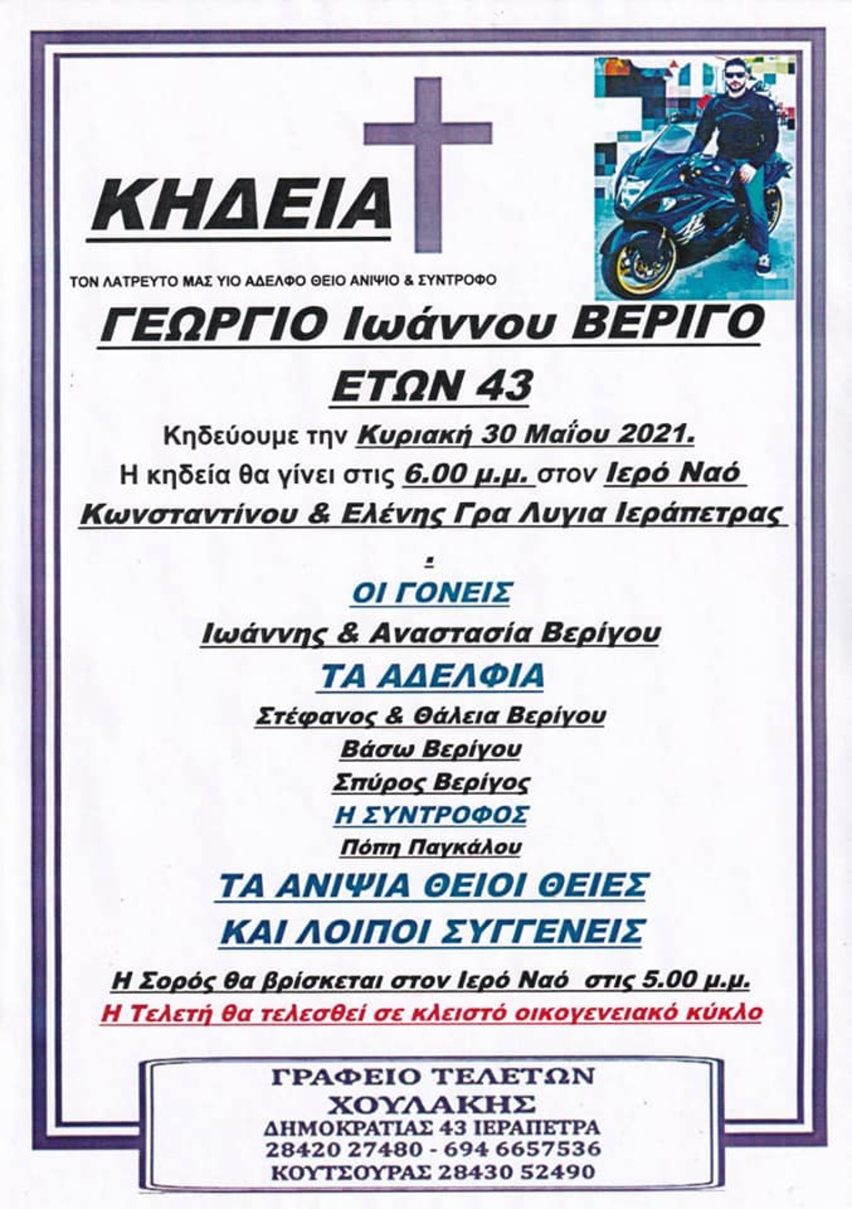 Ολόκληρη η κοινωνία της Ιεράπετρας πενθεί για τον αδόκητο χαμό του 43χρονου με καταγωγή από το χωριό των Μεσσελέρων, που είχε από τα εφηβικά του χρόνια μεγάλη αγάπη για τις μηχανές.