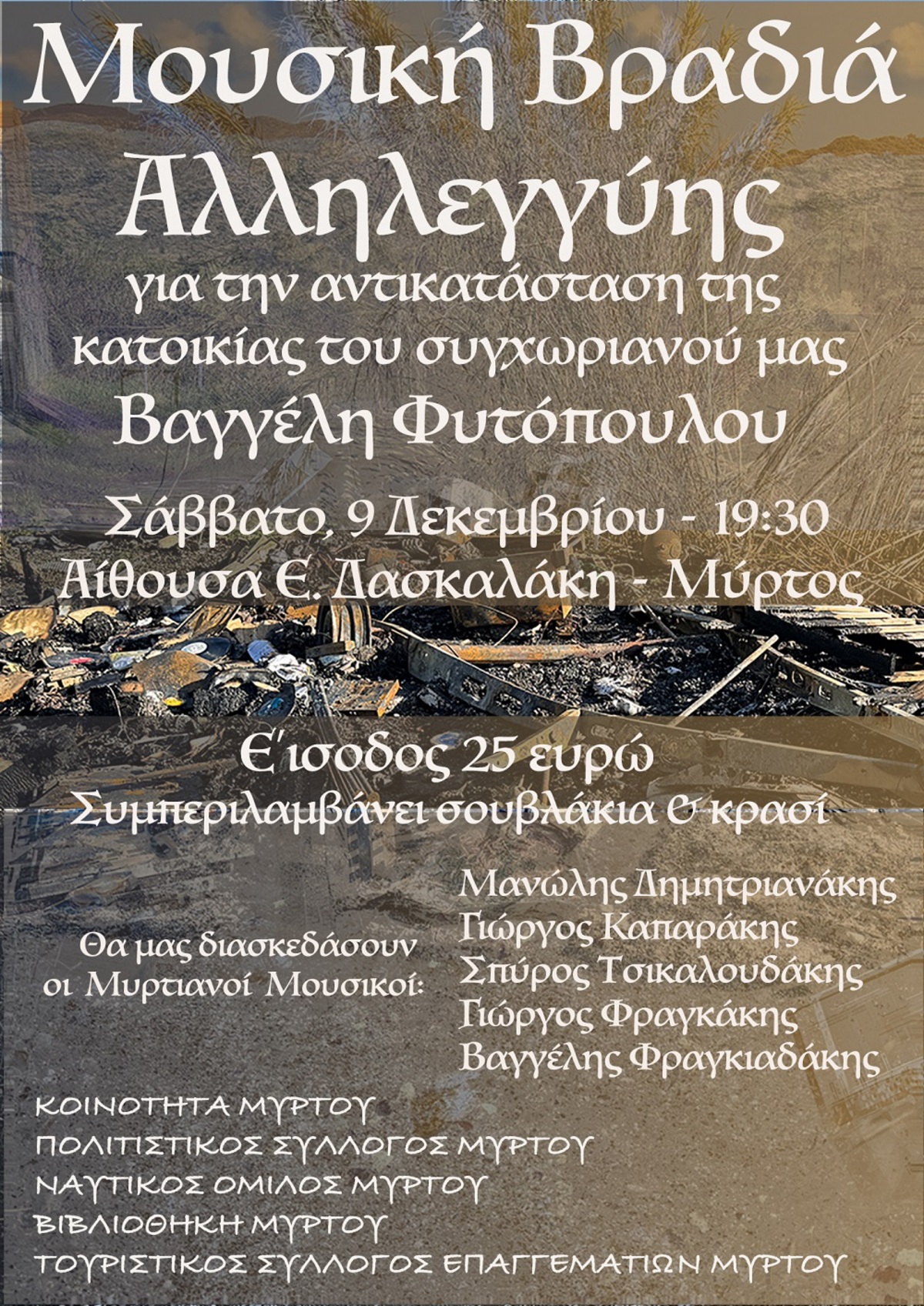 Η Κοινότητα Μύρτου σε συνεργασία με τον Πολιτιστικό Σύλλογο , το Ναυτικό Όμιλο, το Σύλλογο επιχειρηματιών, το Σύλλογο Γονέων και τη Δανειστική Βιβλιοθήκη Μύρτου, διοργανώνουν το Σάββατο 9 Δεκεμβρίου στην αίθουσα Εμμανουήλ Δασκαλάκη στην πλατεία του Μύρτου, εκδήλωση αλληλεγγύης και βοήθειας για το χωριανό μας και φίλο μας Βαγγέλη Φυτόπουλο , με ντόπιους καλλιτέχνες.