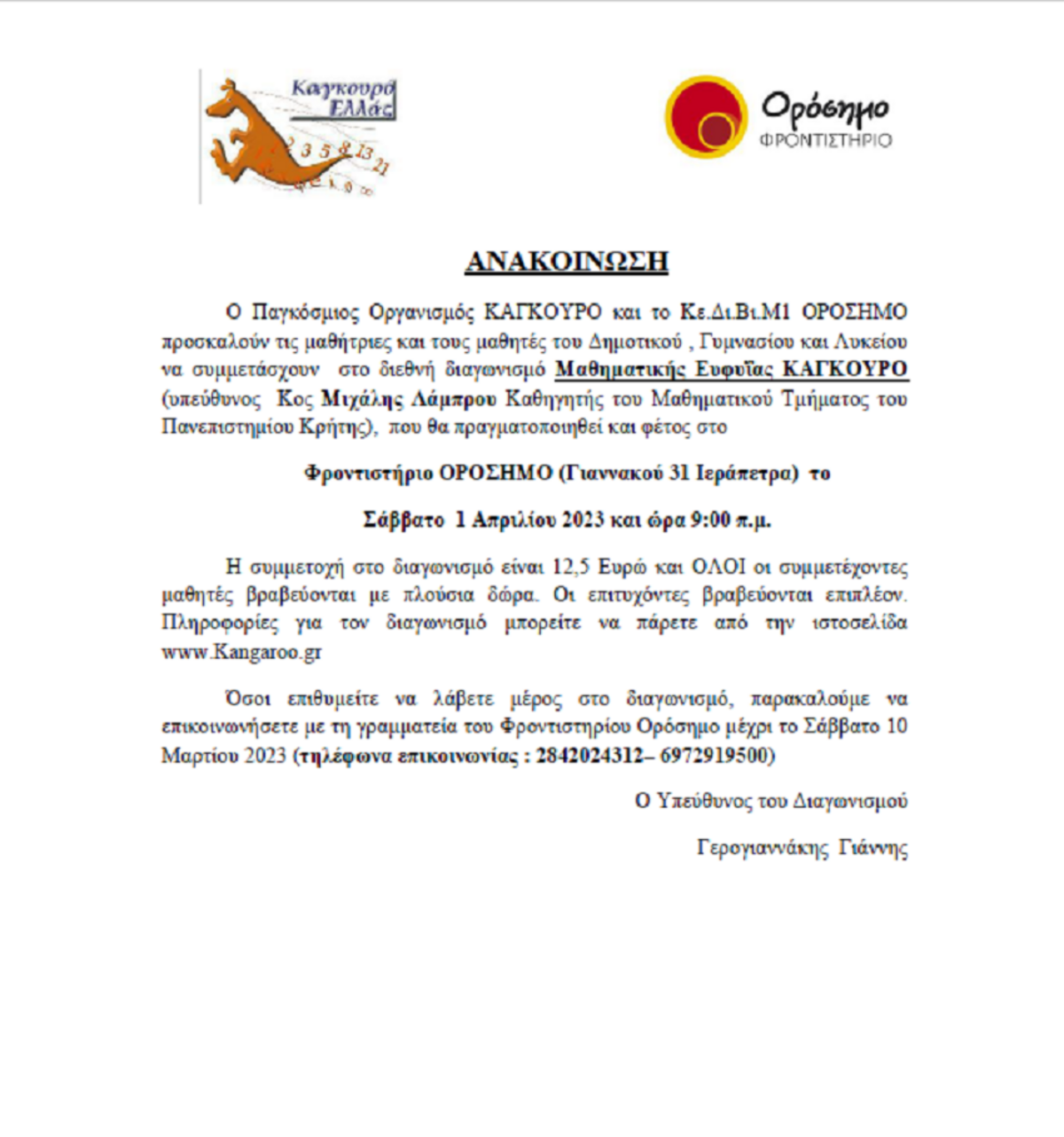 O διεθνής διαγωνισμός Μαθηματικής Ευφυΐας ΚΑΓΚΟΥΡΟ στο Φροντιστήριο Ορόσημο ΛΑΣΙΘΙ ΙΕΡΑΠΕΤΡΑ 12:47 μ.μ. - Δευτέρα 20 Φεβρουαρίου 2023 12:02 μ.μ. - Δευ, 20/47/2023 ΔΙΑΓΩΝΙΣΜΟΣ, ΜΑΘΗΜΑΤΙΚΑ, ΟΡΟΣΗΜΟ, ΚΑΓΚΟΥΡΟ Σάββατο 1 Απριλίου 2023 και ώρα 9:00 π.μ.