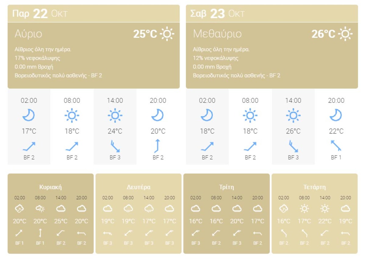 Θερμοκρασία: Στα Δωδεκάνησα από 16 έως 25 βαθμούς Κελσίου. Στα βόρεια 2 με 3 βαθμούς χαμηλότερη.