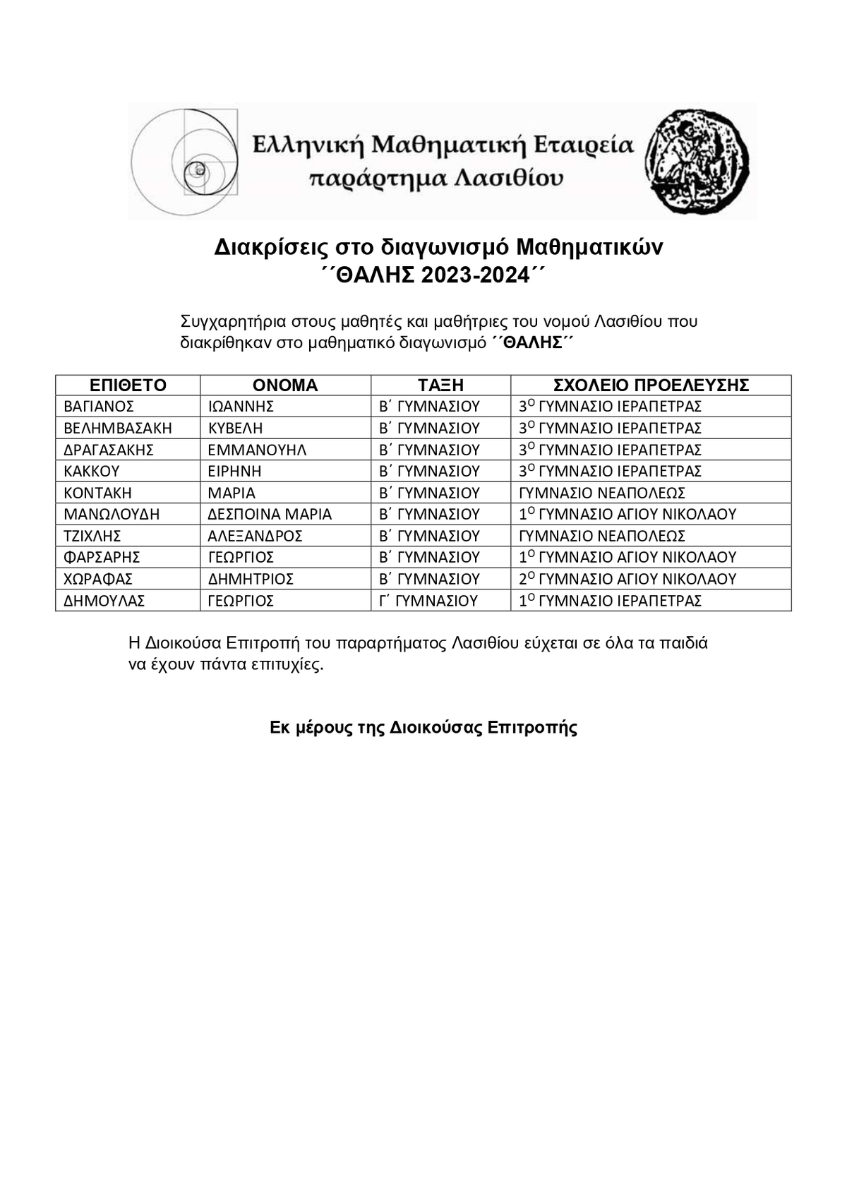 Οι επιτυχόντες μαθητές του Λασιθίου στον μαθηματικό διαγωνισμό «Θαλής» ΛΑΣΙΘΙ ΙΕΡΑΠΕΤΡΑ 2:27 μ.μ. - Σάββατο 30 Δεκεμβρίου 2023 02:12 μ.μ. - Σάβ, 30/27/2023 ΛΑΣΙΘΙ, ΕΠΙΤΥΧΟΝΤΕΣ, ΜΑΘΗΜΑΤΙΚΗ ΕΤΑΙΡΙΑ Η Ελληνική Μαθηματική Εταιρεία ανακοίνωσε τους επιτυχόντες του Μαθηματικού Διαγωνισμού «ΘΑΛΗΣ»