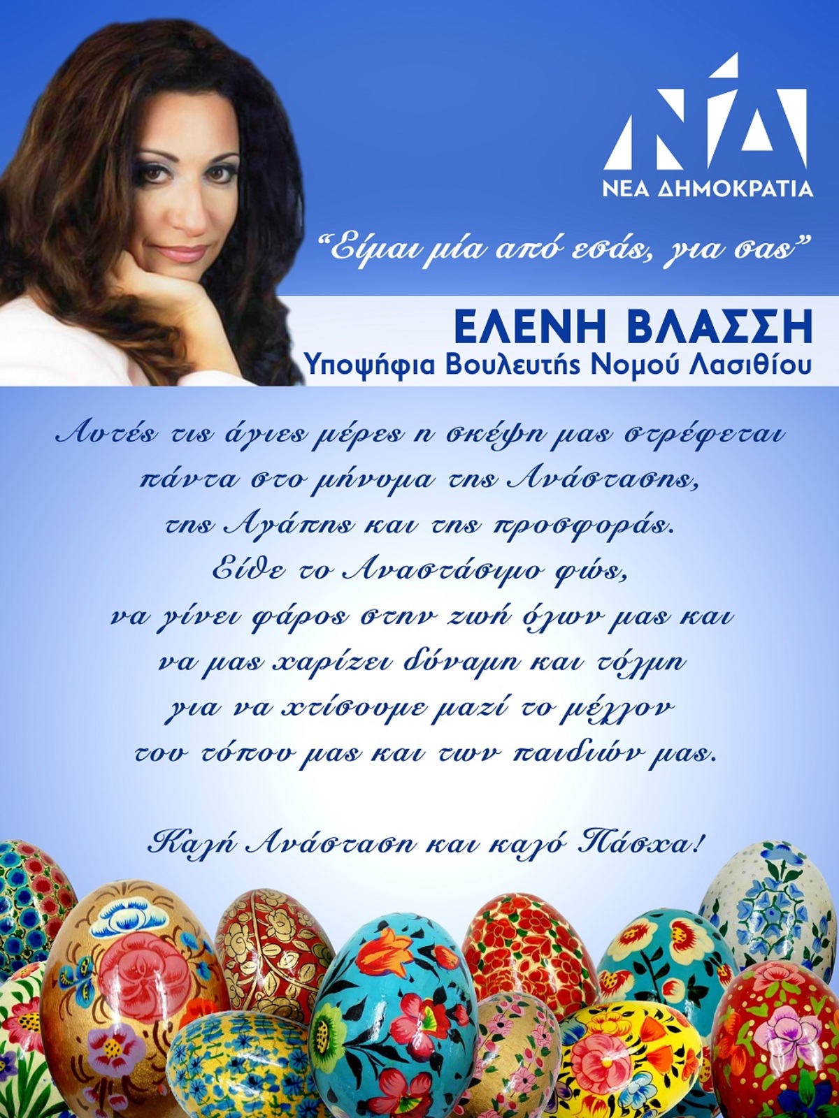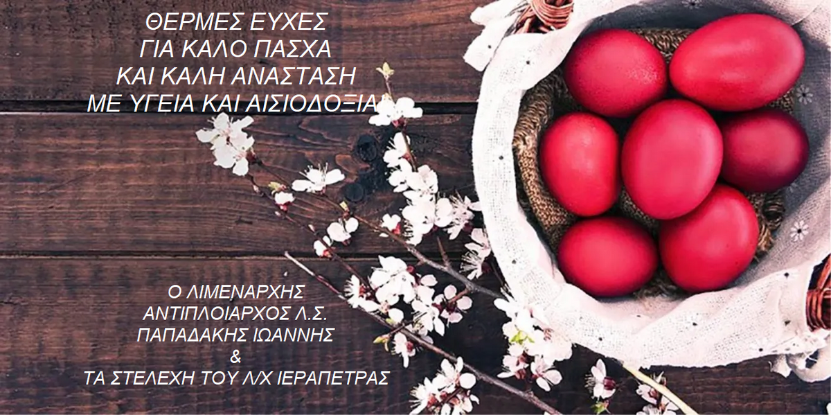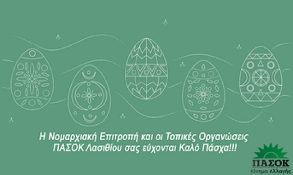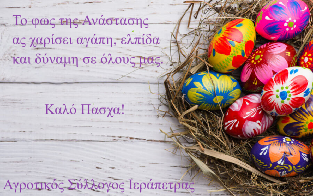 Για τις άγιες μέρες του Πάσχα θέλω να μεταφέρω τις θερμότερες ευχές μου για υγεία, ευτυχία ειρήνη και πρόοδο. Με ανθρωπιά ενότητα συνοχή και ελπίδα να συμπαρασταθούμε σε κάθε δοκιμαζόμενο συνάνθρωπο διδασκόμενοι από την ουσιαστική συνεχόμενη και αδαπάνητη Αγάπη του Θεανθρώπου στον κόσμο