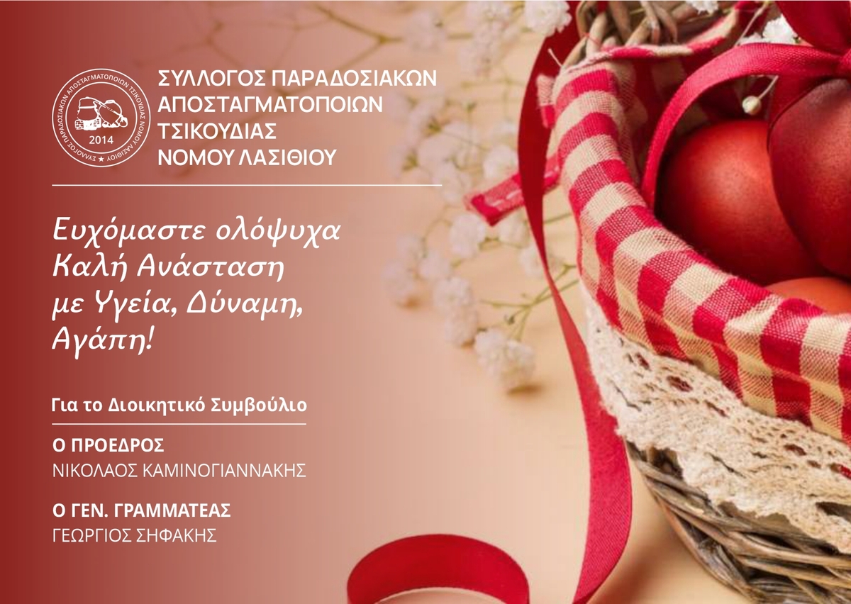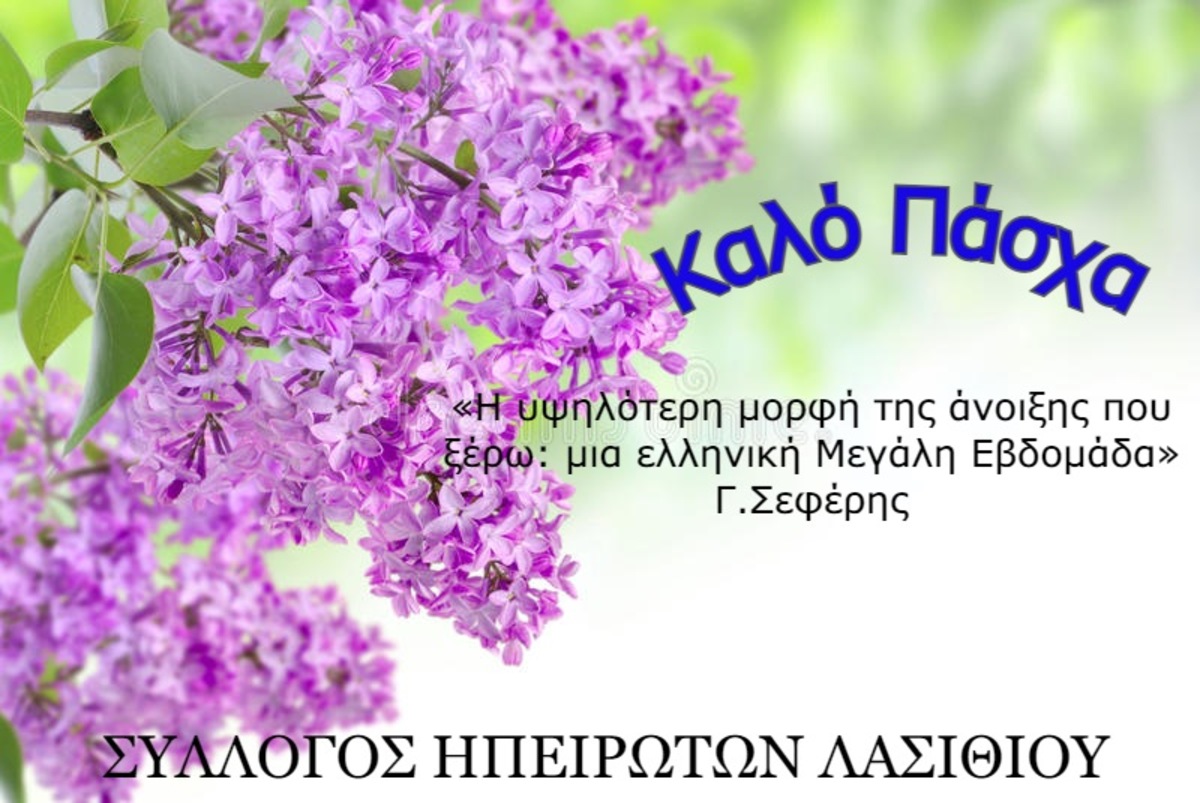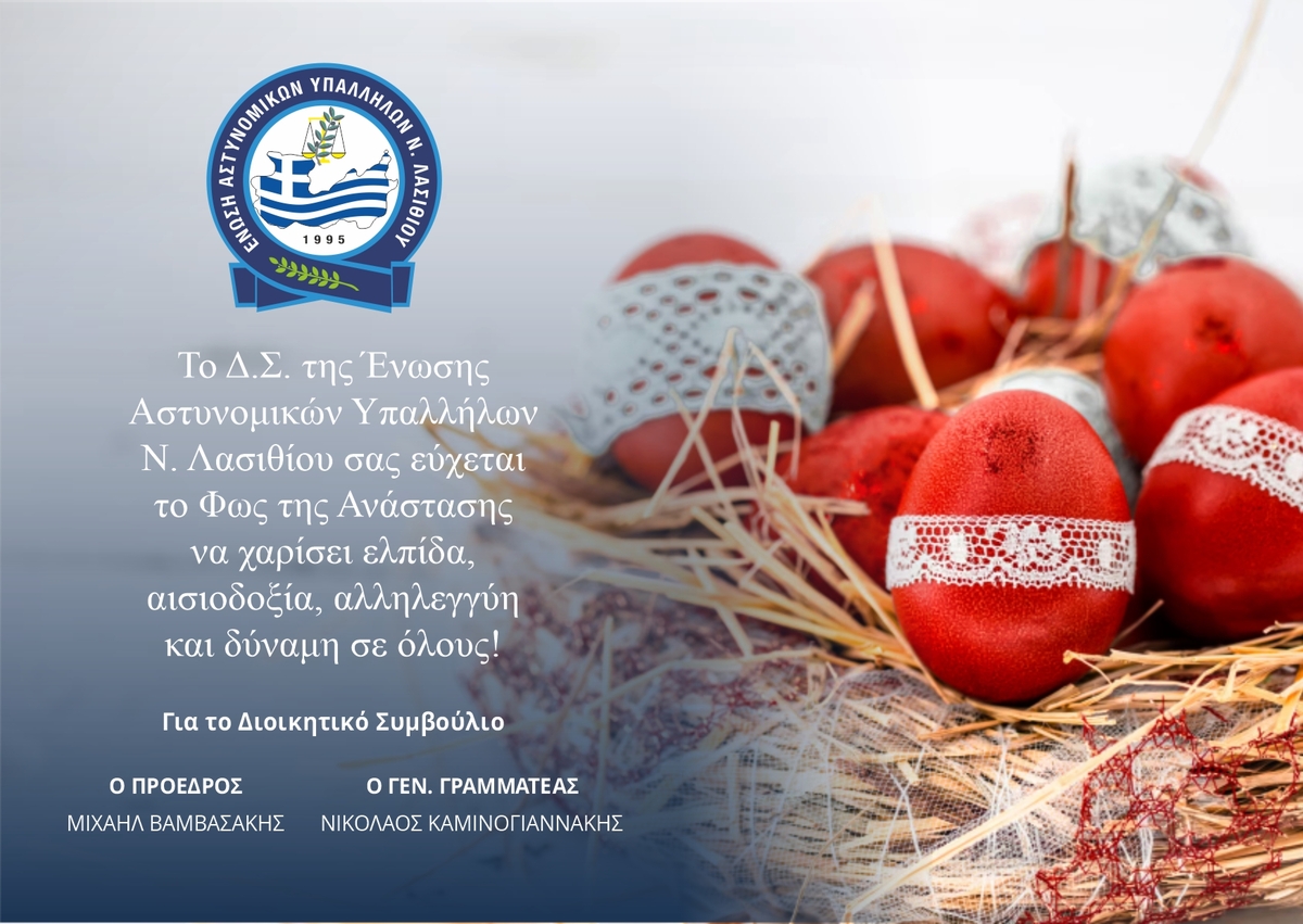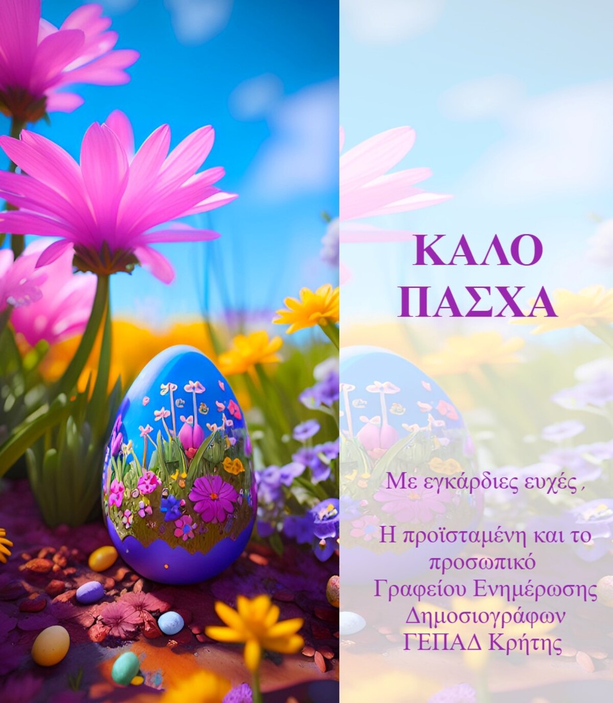 Για τις άγιες μέρες του Πάσχα θέλω να μεταφέρω τις θερμότερες ευχές μου για υγεία, ευτυχία ειρήνη και πρόοδο. Με ανθρωπιά ενότητα συνοχή και ελπίδα να συμπαρασταθούμε σε κάθε δοκιμαζόμενο συνάνθρωπο διδασκόμενοι από την ουσιαστική συνεχόμενη και αδαπάνητη Αγάπη του Θεανθρώπου στον κόσμο
