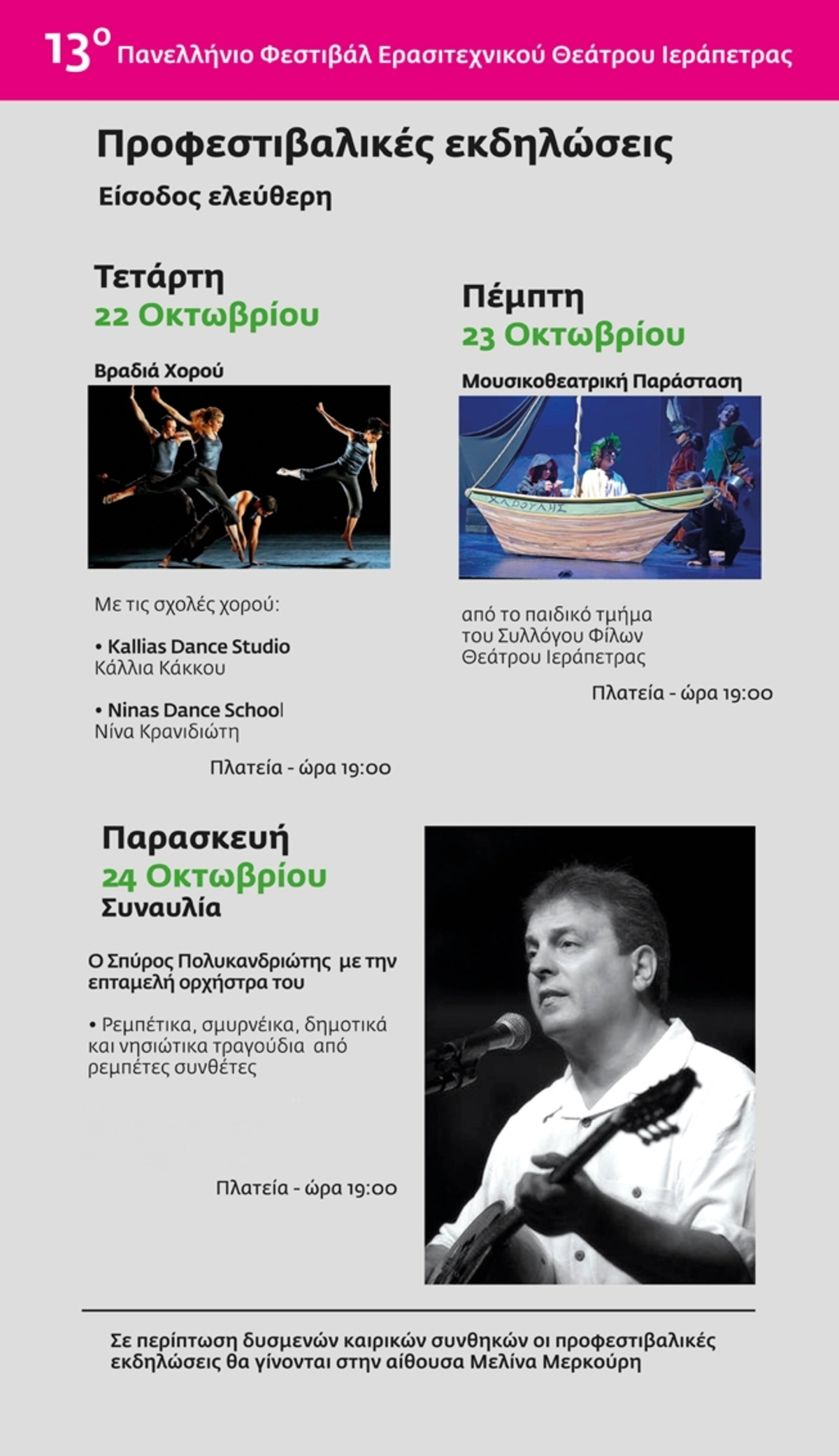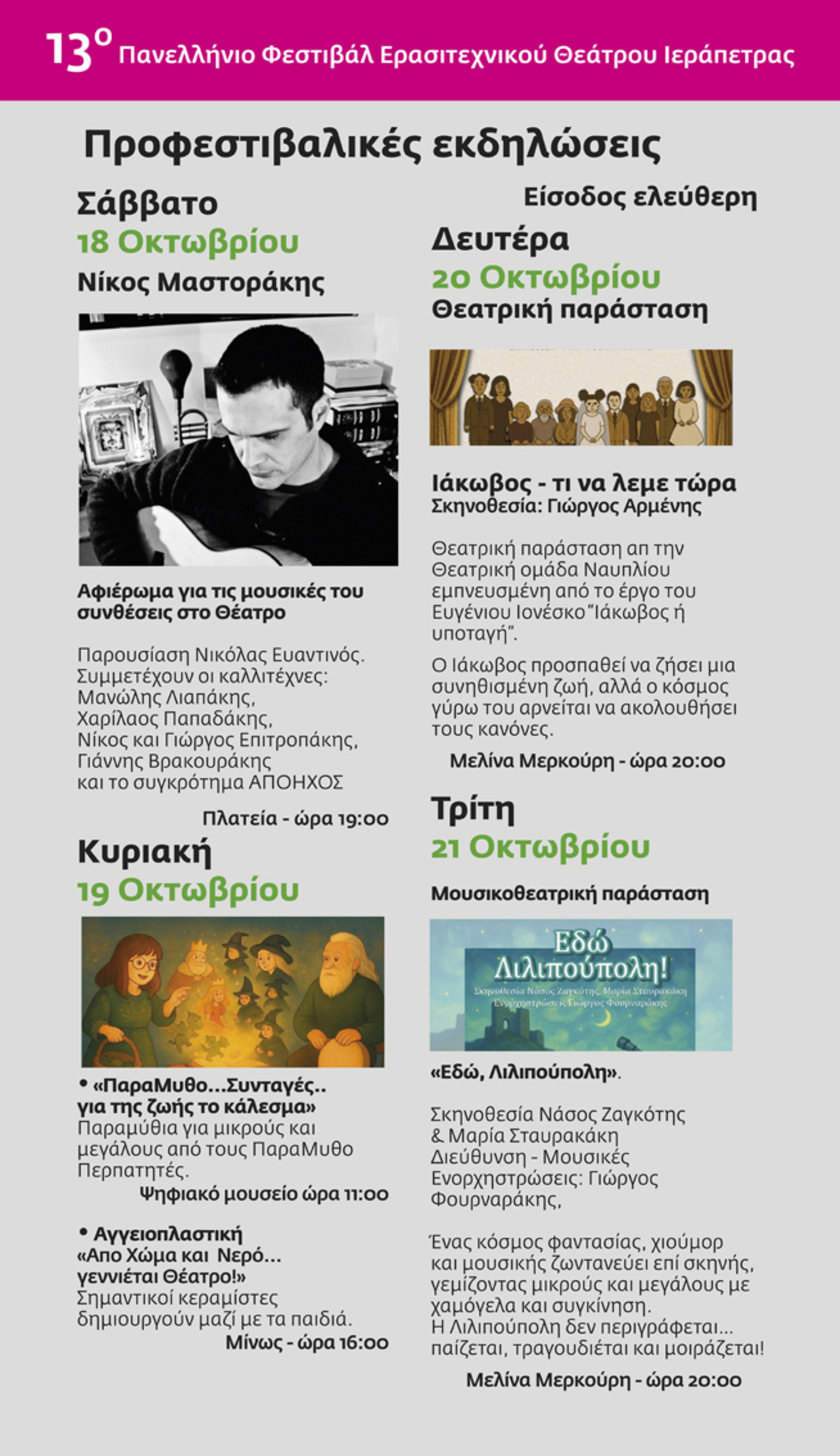 Προφεστιβαλικές εκδηλώσεις με μουσική, θέατρο, χορό και εικαστικά σε όλη την πόλη, από τις 18 Οκτωβρίου έως την 1η Νοεμβρίου – Η καρδιά του ερασιτεχνικού θεάτρου και φέτος στην Ιεράπετρα