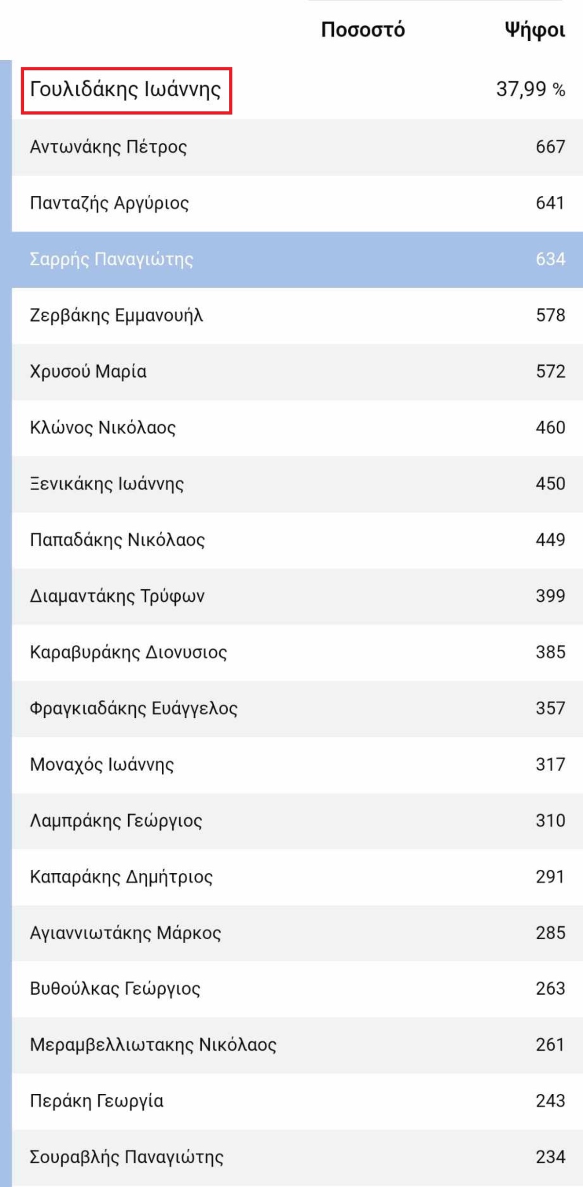 Τα αποτελέσματα στις δημοτικές εκλογές στον Δήμο Ιεράπετρας φέρνουν νέα πρόσωπα στο δημοτικό συμβούλιο και πάμε για τη δεύτερη Κυριακή προκειμένου να προκύψει ο επόμενος Δήμαρχος. Σύμφωνα με το 100% της ενσωμάτωσης των εκλογικών τμημάτων ο Γ. Γουλιδάκης έλαβε ποσοστό 36,48% , ο Εμμ. Φραγκούλης 35,50% , ο Θ. Καλαντζάκης 24,355 και η Μαρία Κοτσιφάκη 3,67%. Όπως προκύπτει λοιπόν Γουλιδάκης και Φραγκούλης πηγαίνουν για τον δεύτερο γύρο και ένας από τους δυο, θα είναι ο επόμενος Δήμαρχος Ιεράπετρας.
