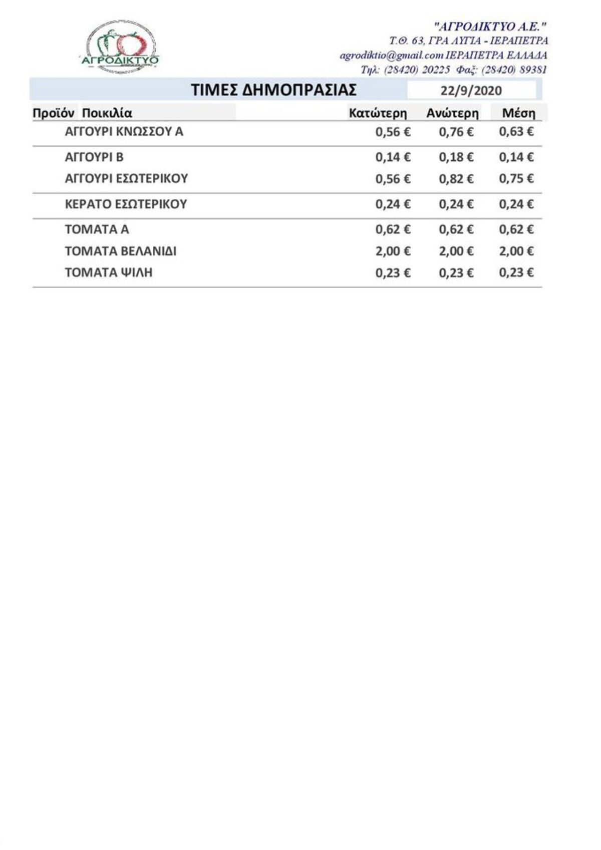 ΤΙΜΕΣ 08:46 π.μ. - 21/01/2026 Τιμές Αγροτικών Προϊόντων 21.01.2026 ΙΕΡΑΠΕΤΡΑ, ΤΙΜΕΣ ΑΓΡΟΤΙΚΩΝ ΠΡΟΙΟΝΤΩΝ , ΔΗΜΟΠΡΑΤΗΡΙΟ, ΚΗΠΕΥΤΙΚΑ Δείτε τις σημερινές τιμές του δημοπρατηρίου
