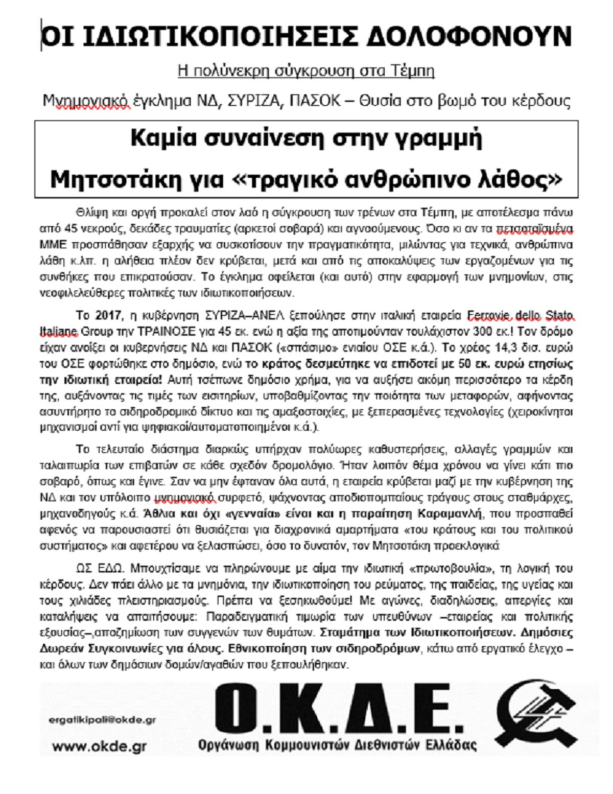 Ο.Κ.Δ.Ε.: Καμία συναίνεση στην γραμμή Μητσοτάκη για «τραγικό ανθρώπινο λάθος» ΕΝΟΤΗΤΕΣ ΠΟΛΙΤΙΚΗ 12:11 μ.μ. - Πέμπτη 2 Μαρτίου 2023 12:03 μ.μ. - Πέμ, 02/11/2023 ΛΑΡΙΣΑ, ΔΕΛΤΙΟ ΤΥΠΟΥ, ΤΡΑΓΩΔΙΑ ΣΤΑ ΤΕΜΠΗ, Ο.Κ.Δ.Ε. Οι ιδιωτικοποιήσεις δολοφονούν