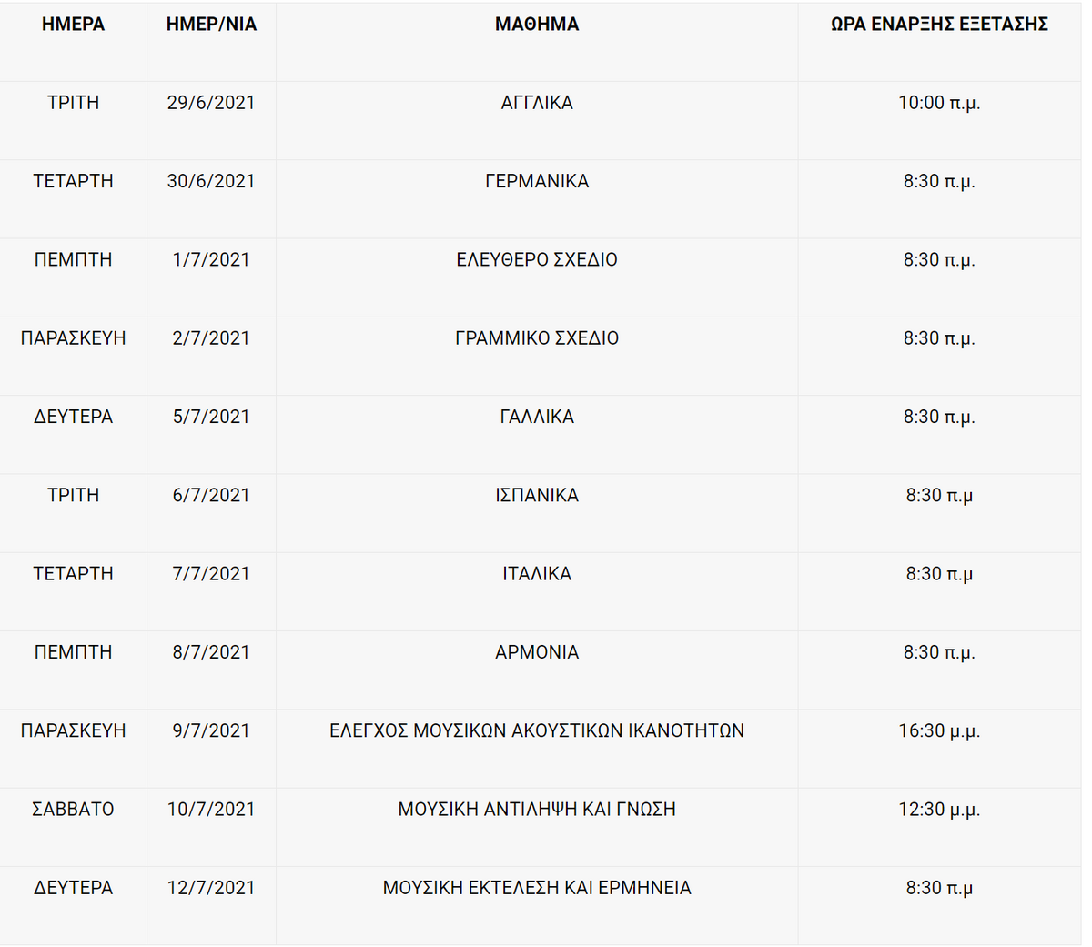 μέχρι τις 08.00 π.μ. για τα μαθήματα με ώρα εξέτασης 08:30 π.μ.,μέχρι τις 09:30 π.μ. για το μάθημα με ώρα εξέτασης 10:00 π.μ.μέχρι τις 16:00 μ.μ. για το μάθημα με ώρα εξέτασης 16:30 μ.μ. καιμέχρι τις 12:00 μ.μ. για το μάθημα με ώρα εξέτασης 12:30 μ.μ.