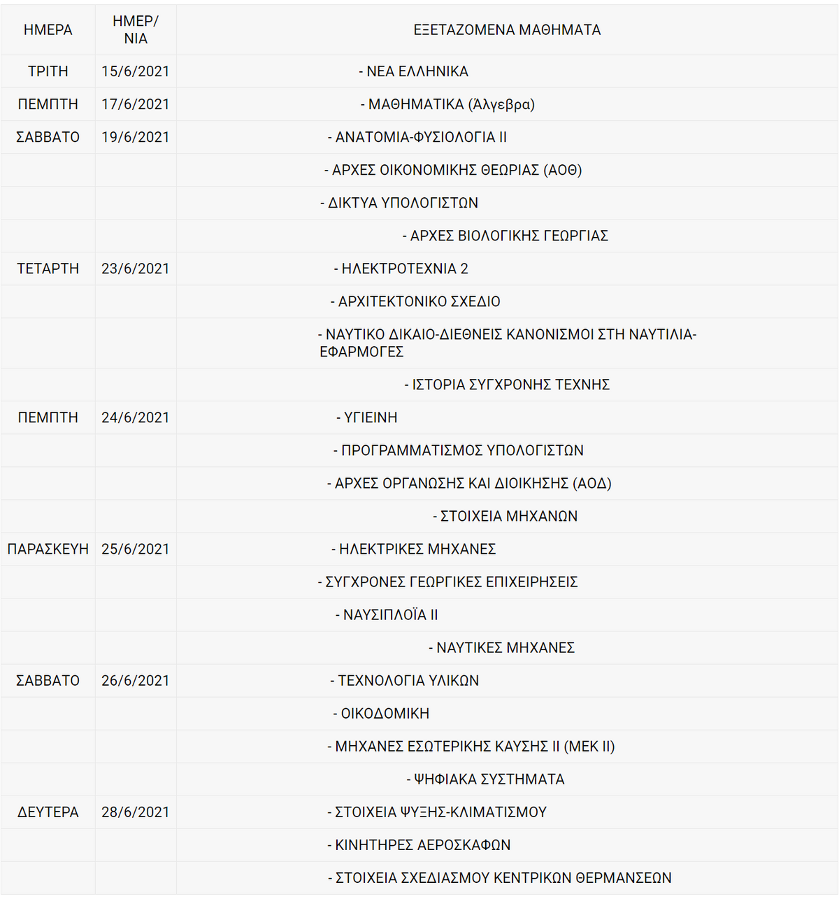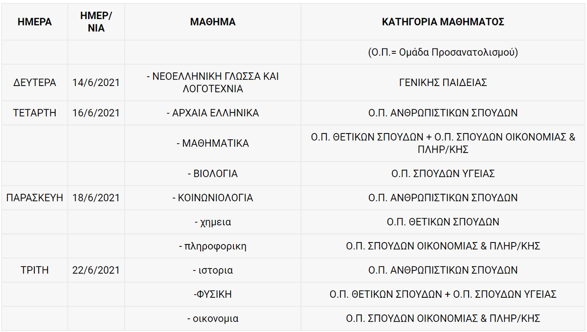 Το πρόγραμμα των πανελλαδικών εξετάσεωνΟι πανελλαδικές εξετάσεις ξεκινάνε παραδοσιακά και φέτος στις 14 Ιουνίου 2021 με το μάθημα των Νέων Ελληνικών στα Γενικά Λύκεια και μία ημέρα αργότερα, δηλαδή στις 15 Ιουνίου 2021, στα Επαγγελματικά Λύκεια.