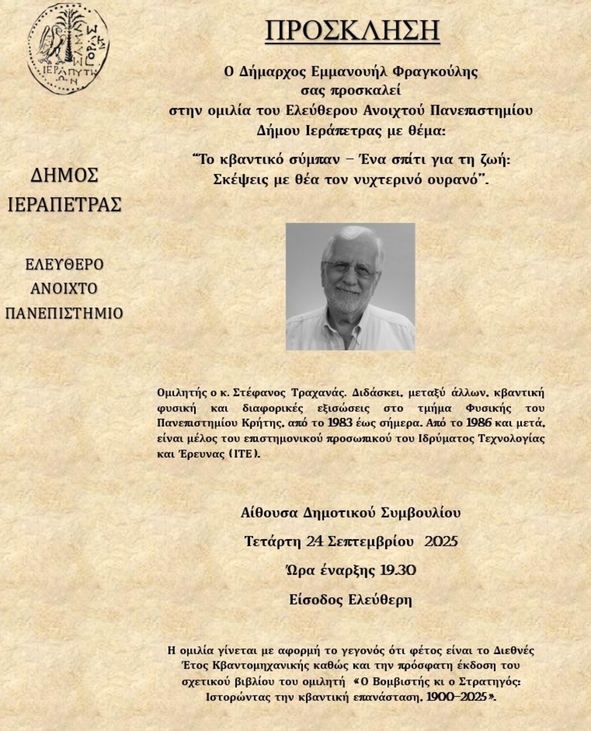 Στην Αίθουσα Δημοτικού Συμβουλίου Ιεράπετρας, την Τετάρτη 24 Σεπτεμβρίου 2025 και ώρα έναρξης στις 19.30. Είσοδος Ελεύθερη