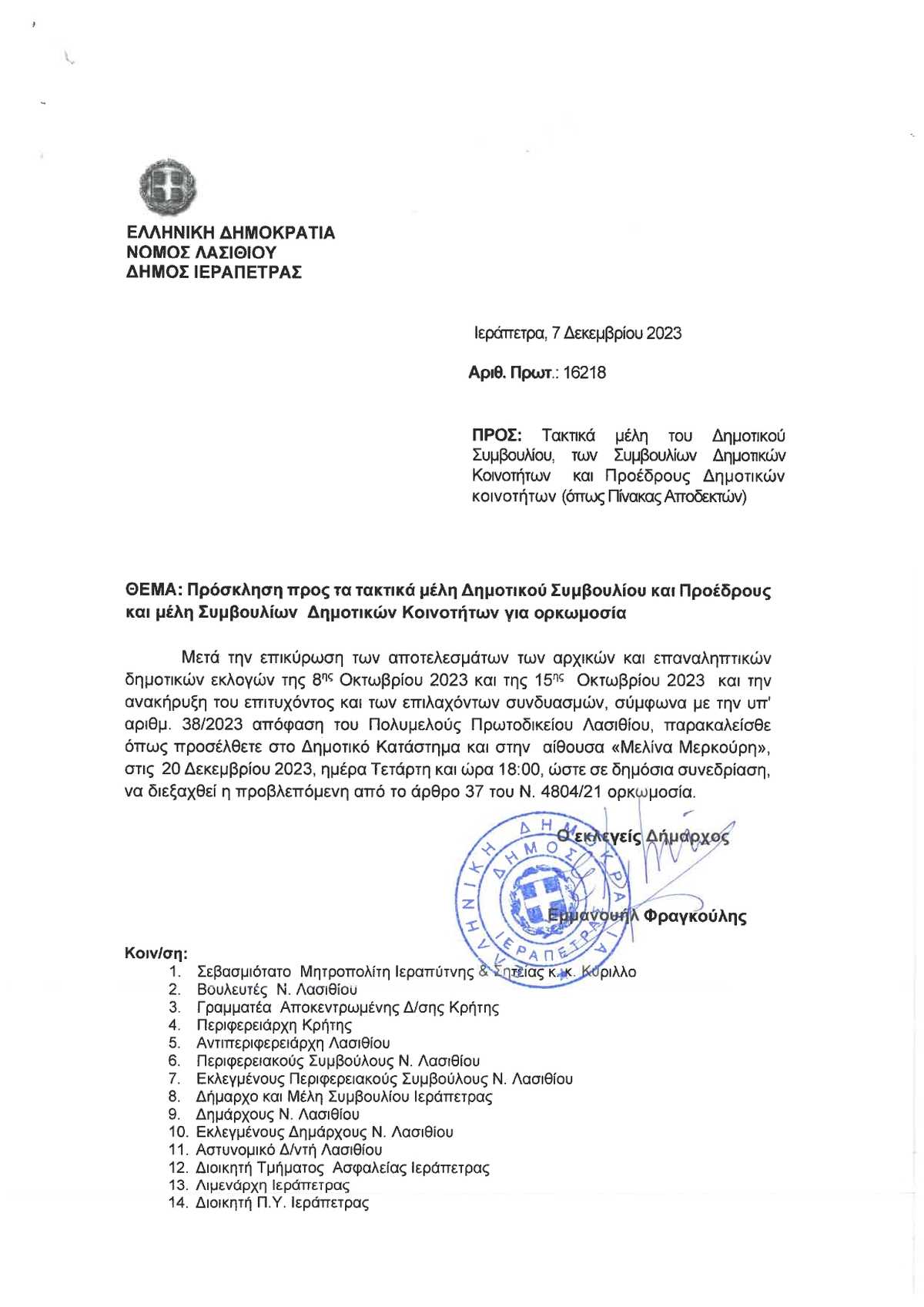 Ορκίζεται το νέο Δημοτικό Συμβούλιο Ιεράπετρας στις 20 Δεκεμβρίου 2023 ΛΑΣΙΘΙ ΙΕΡΑΠΕΤΡΑ 9:17 π.μ. - Παρασκευή 8 Δεκεμβρίου 2023 09:12 π.μ. - Παρ, 08/17/2023 ΙΕΡΑΠΕΤΡΑ, ΔΗΜΟΤΙΚΟ ΣΥΜΒΟΥΛΙΟ, ΟΡΚΟΜΩΣΙΑ Στην αίθουσα "Μελίνα Μερκούρη" στις 18:00