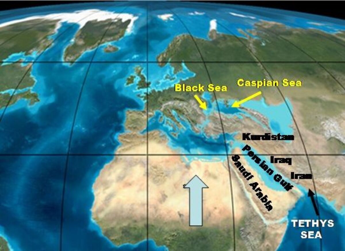 Συγκεκριμένα, από τα τέλη του Παλαιοζωικού Αιώνα μέχρι σήμερα η περιοχή μεταξύ της Αφρικανικής Πλάκας και της Ευρασιατικής Πλάκας γνώρισε δύο μεγάλες γεωλογικές περιόδους που είναι υπεύθυνες για τα αποθέματα σε υδρογονάνθρακες που έχει η ανθρωπότητα. Αυτές οι δύο περίοδοι είναι οι εξής: Η πρώτη είναι η περίοδος της δημιουργίας του Ωκεανού της Τιθύος που κράτησε περίπου 245 εκατομμύρια χρόνια. Η δεύτερη είναι η περίοδος που αφορά την εξαφάνιση του Ωκεανού της Τιθύος και την δημιουργία του Περσικού Κόλπου και της Μεσογείου Θάλασσας.