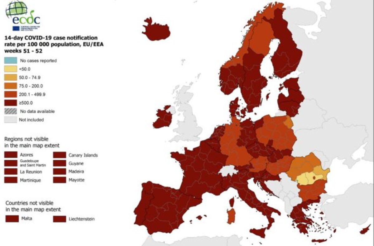 Στο χάρτη του ECDC, ο οποίος «φωτογραφίζει» την επιδημιολογική κατάσταση στην Ευρώπη, μεγάλο μέρος της Γηραιάς Ηπείρου βυθίζεται στο «κόκκινο» στον σύνθετο δείκτη, ο οποίος περιλαμβάνει στοιχεία για κρούσματα κοροναϊού, θετικότητα και ρυθμό τεστ.