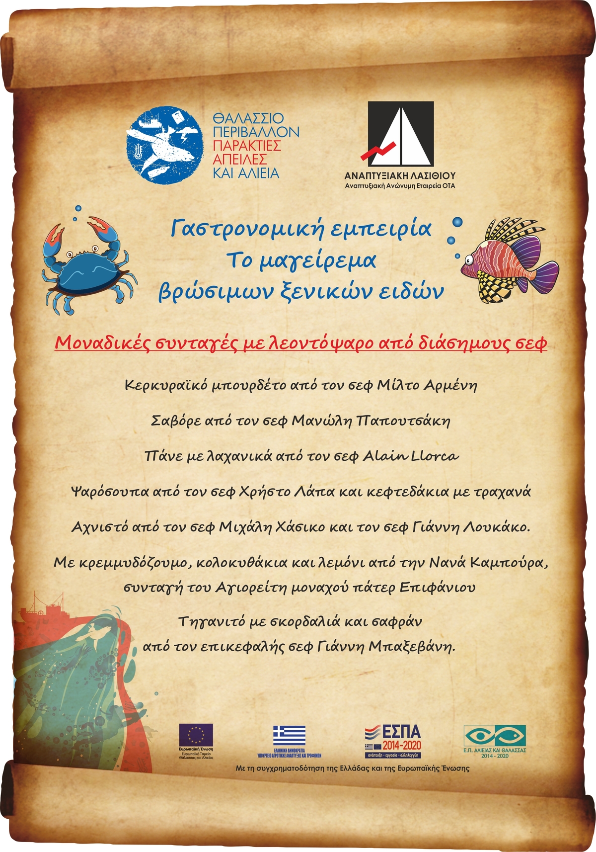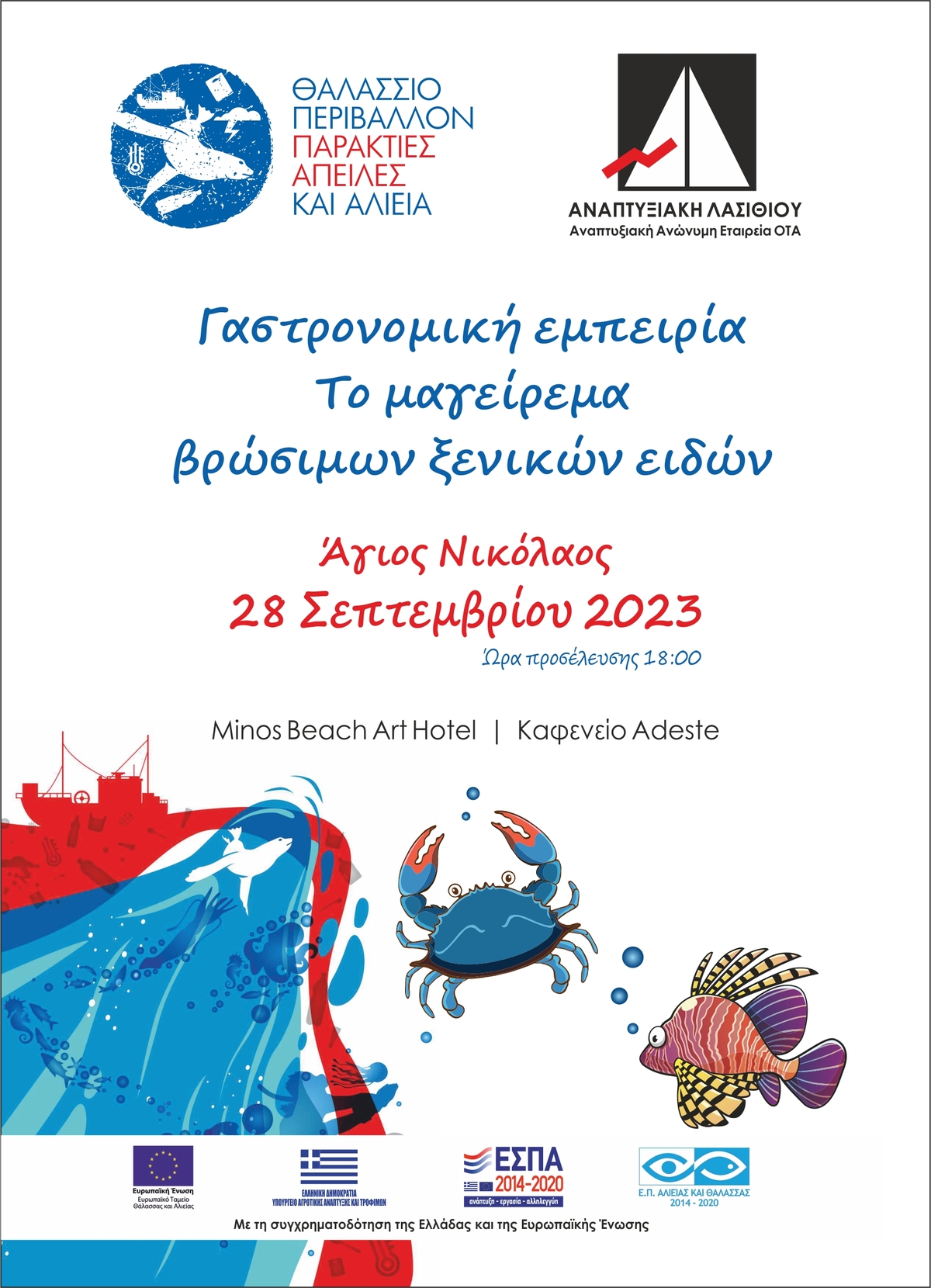 Για το σκοπό αυτό στις 28 Σεπτεμβρίου 2023 διοργανώθηκε στον Άγιο Νικόλαο (ξενοδοχείο Minos Beach Art Hotel) μια ενημερωτική - γαστρονομική εκδήλωση με θέμα: «Γαστρονομική εμπειρία. Το μαγείρεμα βρώσιμων ξενικών Ειδών» στην οποία διακεκριμένοι σεφ παρουσίασαν τις δικές τους προτάσεις συνδυάζοντας την υψηλή γαστρονομία με τη παραδοσιακή κρητική κουζίνα, τις απαιτήσεις για υγιεινή διατροφή με την εξαιρετική διατροφική αξία του λεοντόψαρου και του μπλε καβουριού.