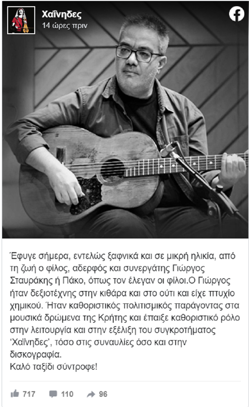 «Έφυγε σήμερα, εντελώς ξαφνικά και σε μικρή ηλικία, από τη ζωή ο φίλος, αδερφός και συνεργάτης Γιώργος Σταυράκης ή Πάκο, όπως τον έλεγαν οι φίλοι. Ο Γιώργος ήταν δεξιοτέχνης στην κιθάρα και στο ούτι και είχε πτυχίο χημικού.