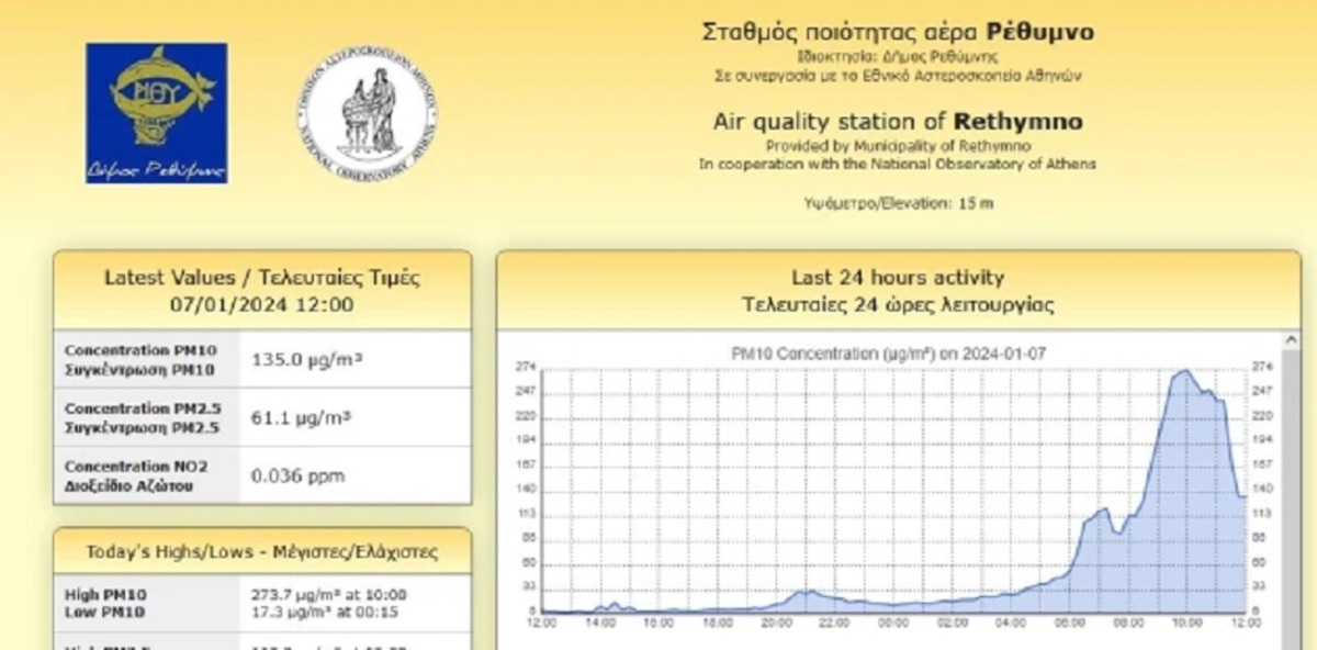 Το διάγραμμα δίνει τις μετρήσεις αιωρούμενων σωματιδίων από το σταθμό ποιότητας αέρα που έχουμε εγκαταστήσει στο Δημαρχείο Ρεθύμνου, στο πλαίσιο του Ολοκληρωμένου Συστήματος Ενημέρωσης και Προειδοποίησης που έχουμε αναπτύξει σε συνεργασία με το Δήμο Ρεθύμνης. Το πρωί της Κυριακής 07/01 κατεγράφησαν συγκεντρώσεις αιωρούμενων σωματιδίων οι οποίες ξεπέρασαν τα 270 μικρογραμμάρια ανά κυβικό μέτρο όταν το όριο που έχει θεσπίσει η Ε.Ε είναι 50 mgr-m3 το πολύ για 35 μέρες τον χρόνο καθώς βλάπτουν τα πνευμόνια.
